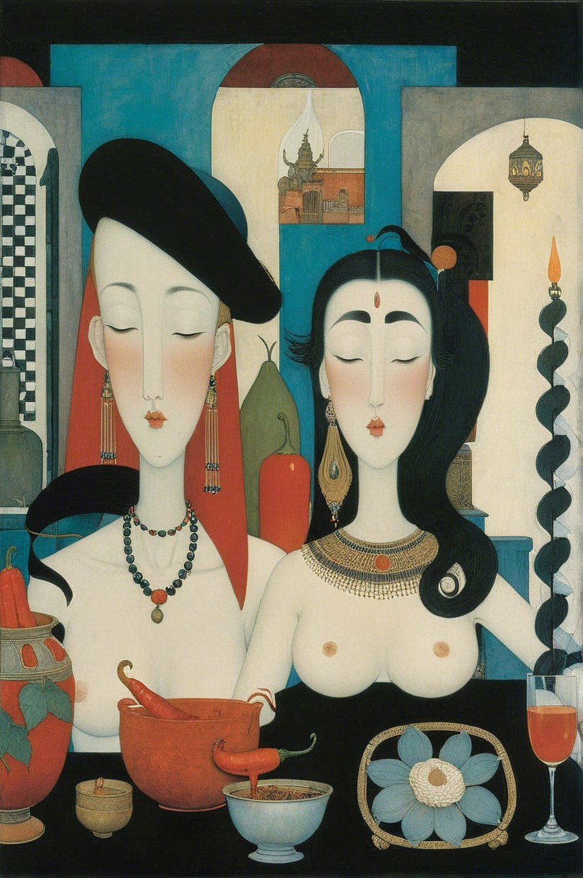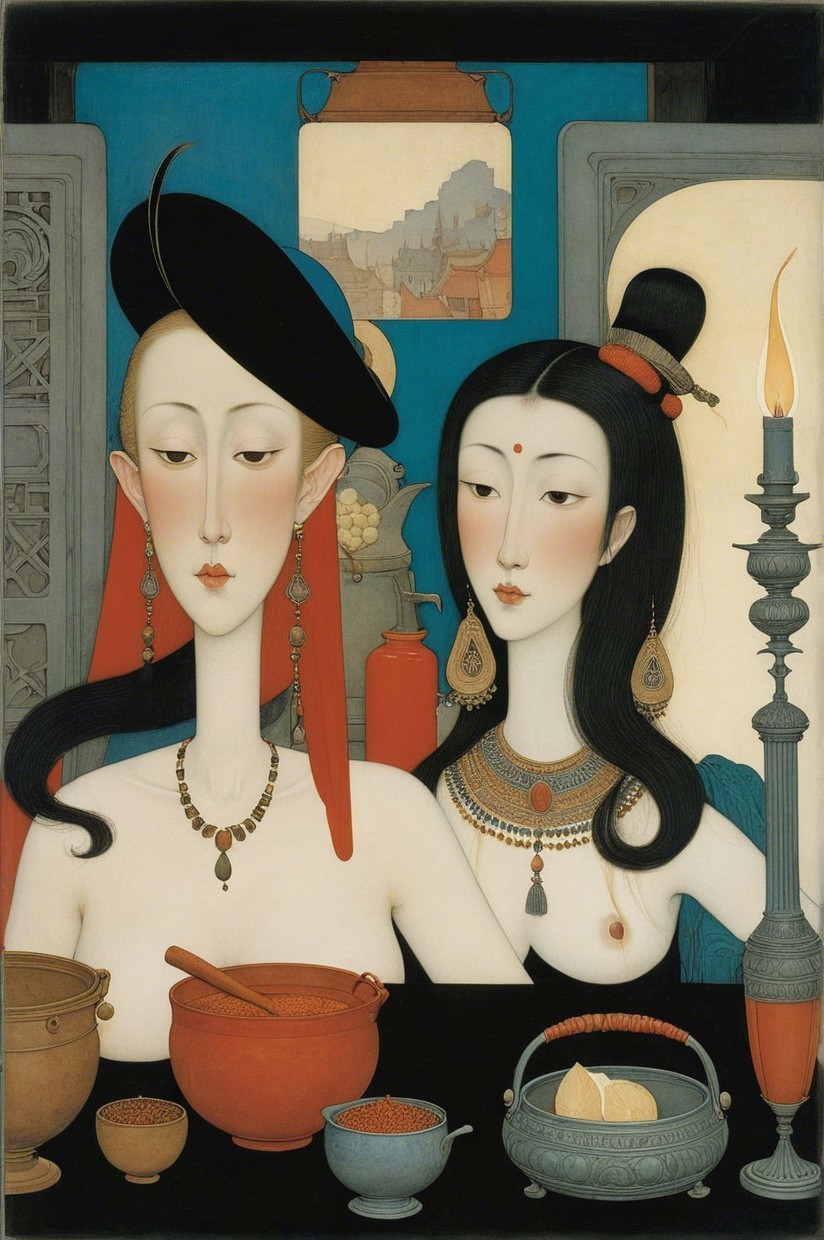 The image features two elegant women with distinct, ethereal features, adorned in intricate jewelry and traditional attire, set against a mystical backdrop with soft lighting and ornate artifacts.