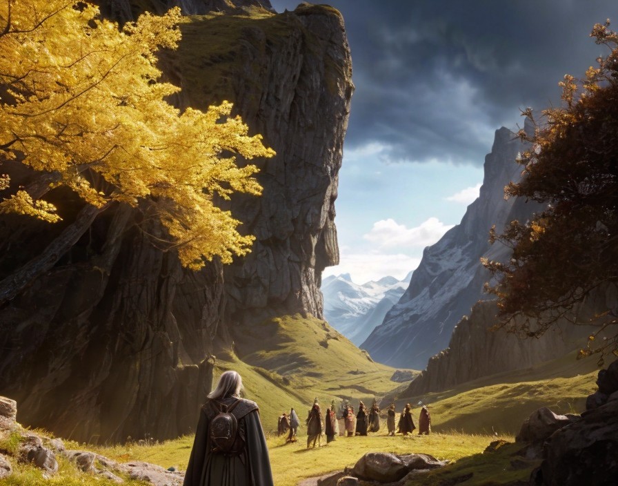 Epic fantasy quest, mystical ring of power, diverse fellowship, hobbit hero, dark lord's sinister influence, lush Middle-earth landscapes, majestic mountains, ancient forests, magical creatures, iconic characters, intricate elvish designs, detailed armor and weaponry, dramatic battles, heroic deeds, emotional bonds, friendship and loyalty themes, mythical realms, grand adventure, intricate storytelling, vibrant color palette, atmospheric lighting, high fantasy style, inspired by Alan Lee and John Howe, Artstation.