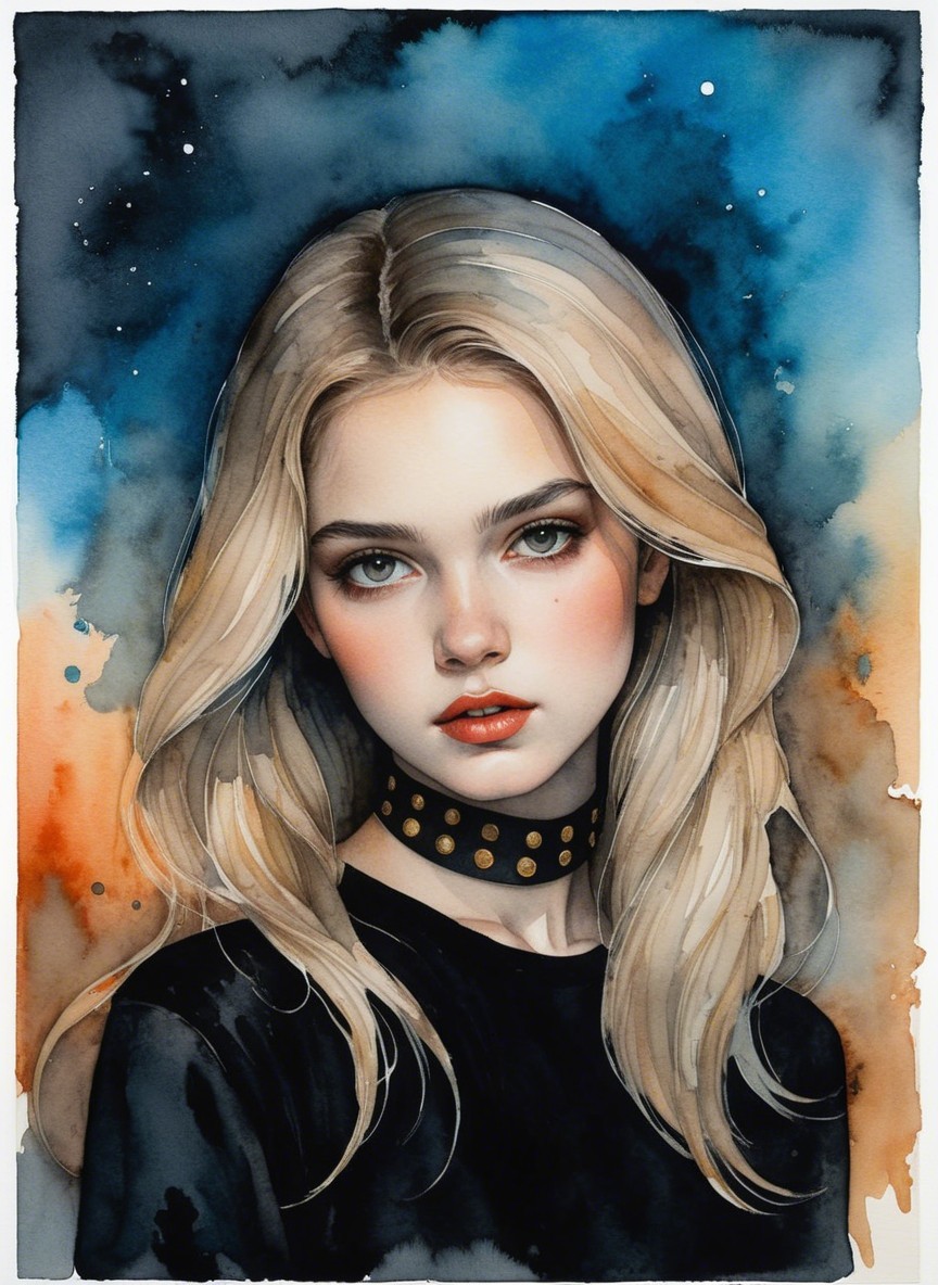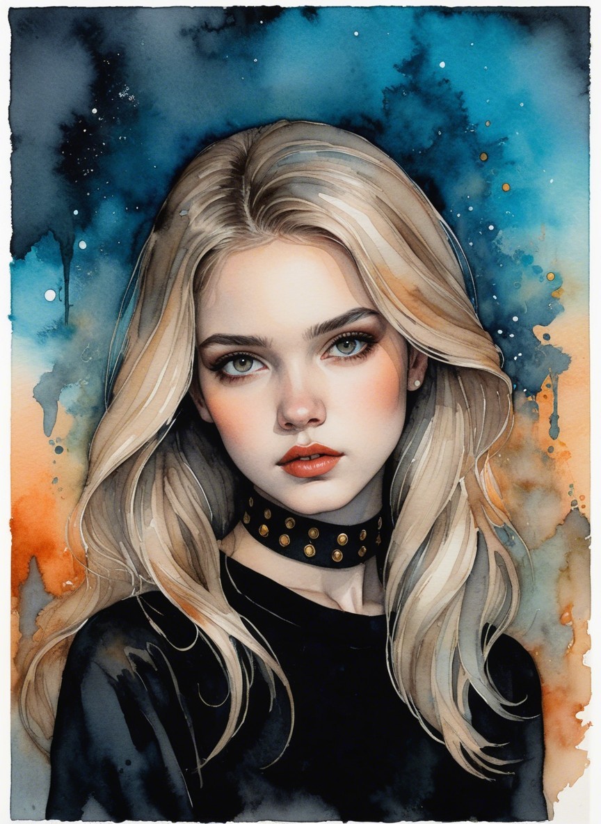 A captivating portrait of a young woman with long, flowing blonde hair and striking green eyes. She wears a black top with a choker, set against a vibrant watercolor background of blues and oranges.