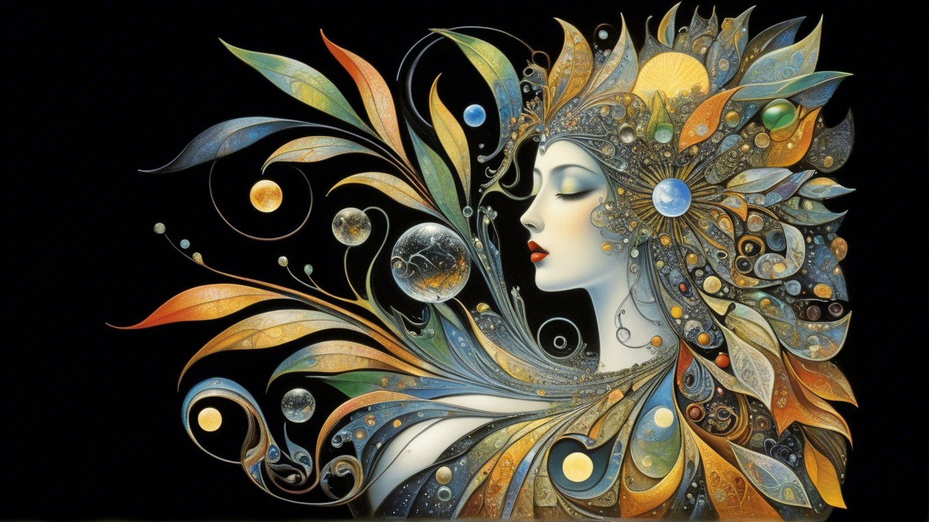 The image features a stylized woman with flowing hair, adorned with cosmic elements like planets and stars, set against a dark background. Vibrant colors enhance her ethereal appearance.