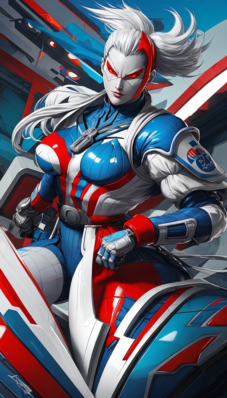 + Prompt:Streetfighter characters, dynamic pose, art deco, cel shaded, irregular angle view, organic tropic cybernetic with futuristic modern silver blue white red colors, patriotic themed, defined, neat, contrast, detailed, realistic badass 3d illustration, comics art/extremely-ultra-detailed line-art. The artwork features high contrast, colorful, striking detailed art style, outline, no text