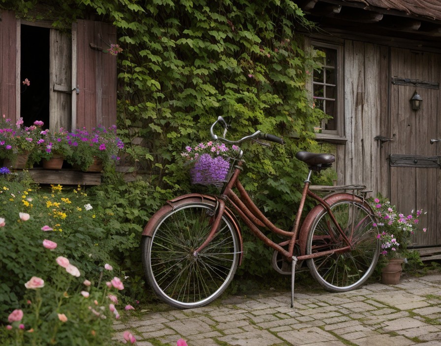 A rusty bike with flowers is staying next to an old small wooden cottage in the rose garden.