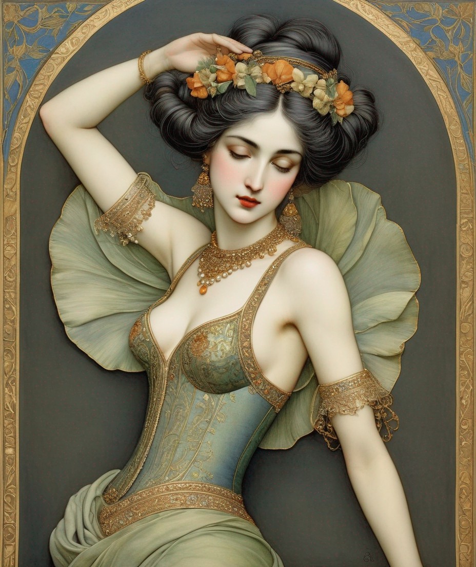 + Prompt:Nymph of sweet peas. 3rd century Persian miniature art, golden ochre, sage green, pearl grey, paprika, blue-grey, Velvet Black, Shabby, Dull Gold, Amber Gray, Golden Ratio, Surreal Fantasy, Elegant, High Definition Ultra Fine 3D Line, Zenangle Style, Watercolor Patchwork , Arthur Rackham Style, Extremely Detailed, Intricate, Thoughtful, HDR, Fractal, Beautiful, Award Winning, Fantasy Look, Fantasy, Crisp Quality