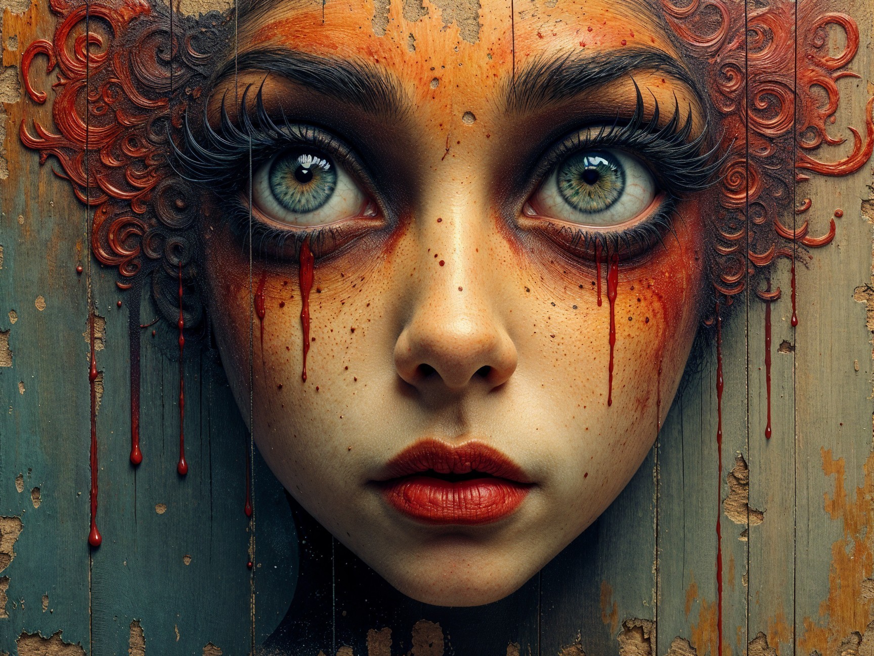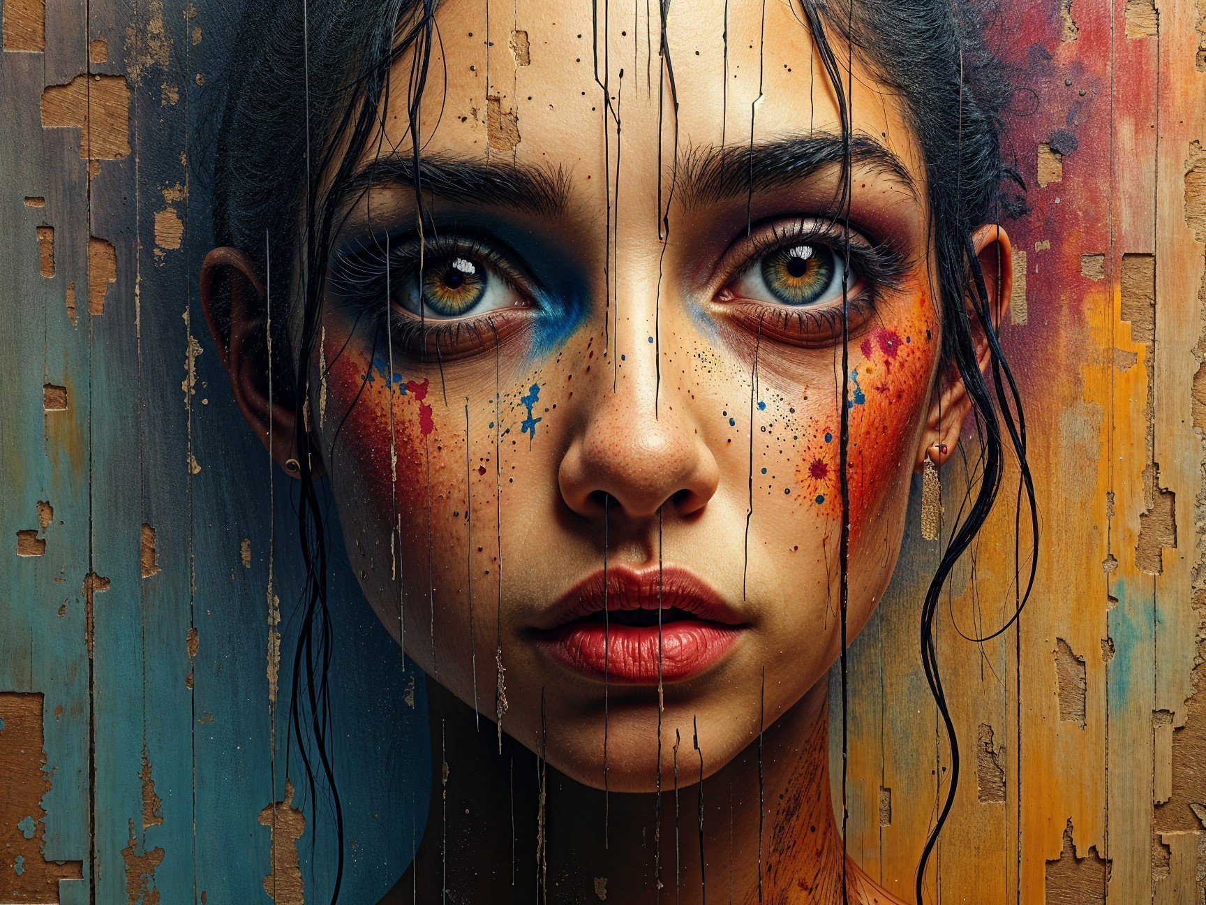 Prompt: "Intense portrait capturing the essence of the human soul, inspired by Gonzalo Pizarro, intricate details, emotional depth, vibrant colors, surreal elements, expressive eyes, textured background on discarded oriented strand board wood, unique wood grain patterns, visible grains, rough edges, artistic distressing, hand-chopped and sanded wood, mixed media art, fusion of painting and woodworking, symbolic motifs, ethereal and mystical atmosphere, intricate brushwork, raw and organic feel, by a skilled wood artist and painter, high resolution for detailed viewing, warm and dramatic lighting to enhance the depth and textures."