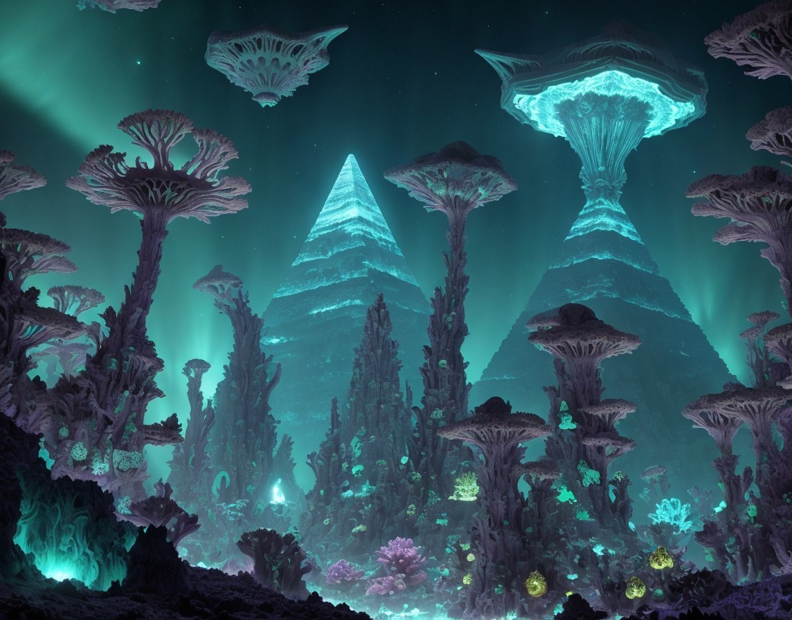 + Prompt:Extraterrestrial menagerie pyramid assimilated with advanced alien technology in a deep-sea aquatic landscape with massive ravines and a flourishing coral reef, statues of neptune, fish, and octopuses, large jagged phosphorescent crystals and cthulu like sea monster with long tentacles. Phosphorescent crystals. sacred geometry, mystical, Realistic and natural elements, In the style of Cameron Gray