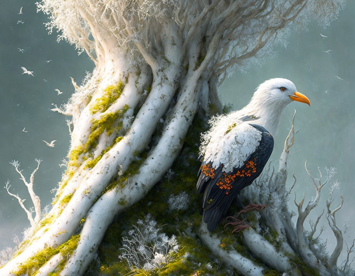 Artist Jean-Baptiste Monge style. White crows. Poland's "Crooked Forest". Bent curved crooked pale orange trees. White vines. White tendrils. White moss. White lichen. White grass. White Shrubs. White flowers. White Meadow.
