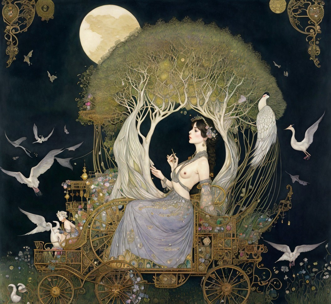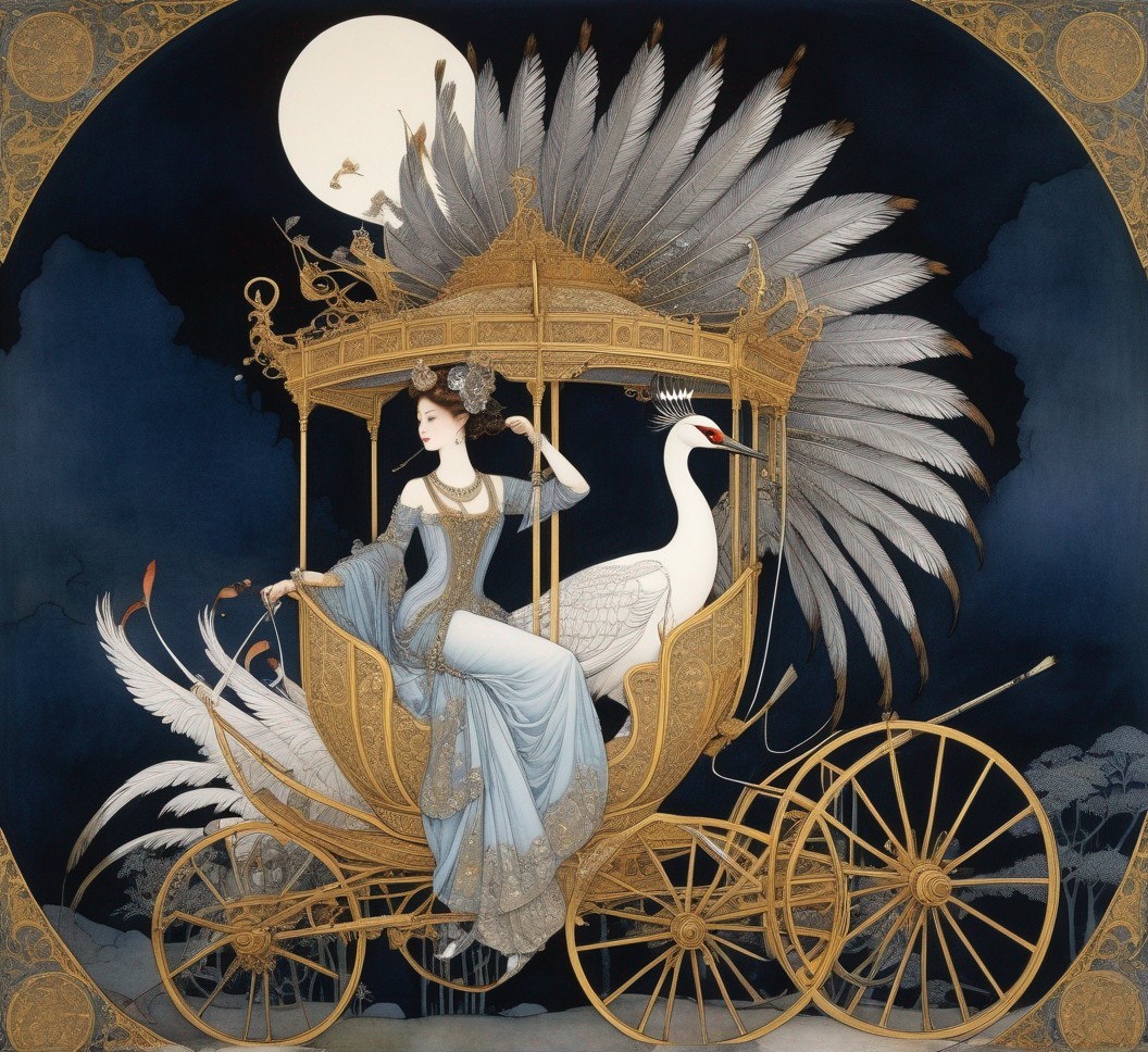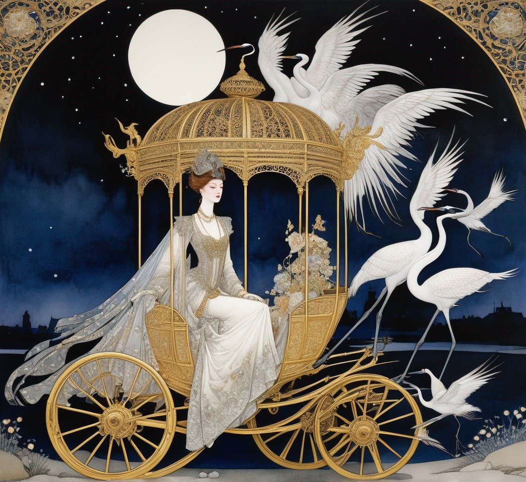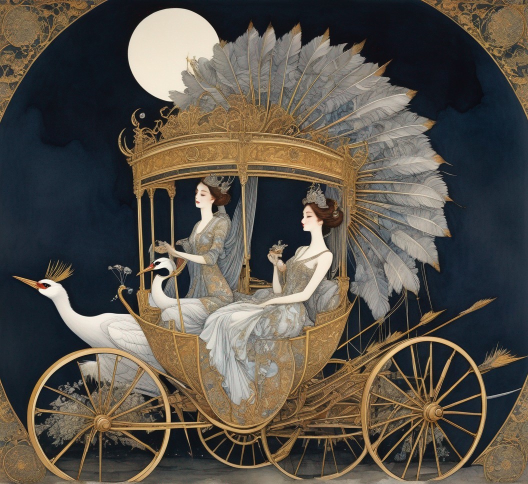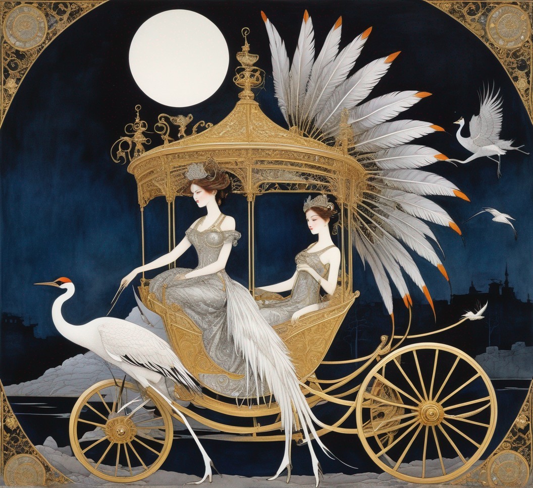 Two elegantly dressed women in a golden carriage surrounded by cranes under a moonlit sky.