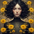 A striking portrait of a young woman with curly black hair and delicate freckles, framed by vibrant yellow flowers. The background enhances her ethereal beauty and captivating presence.