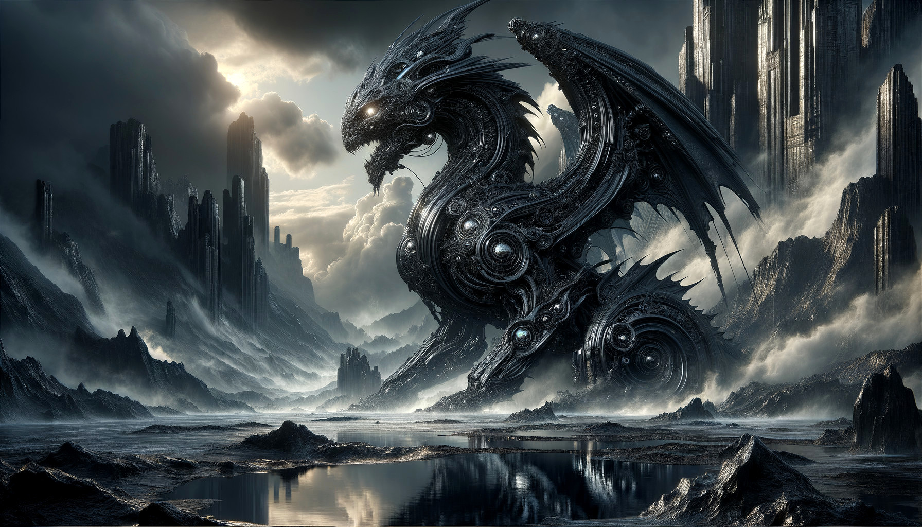 A majestic mechanical dragon amidst a dark, dramatic landscape with towering spires, clouds, and still water reflecting the scene.