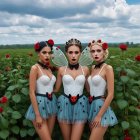 Two models pose against a breathtaking sunset backdrop, wearing elegant white lingerie adorned with lace and red accents, set against a scenic mountain landscape.