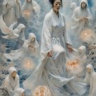 The image depicts a serene scene with a central figure in flowing white robes, surrounded by women and doves. They hold glowing lanterns, creating an ethereal atmosphere amidst mist and water.