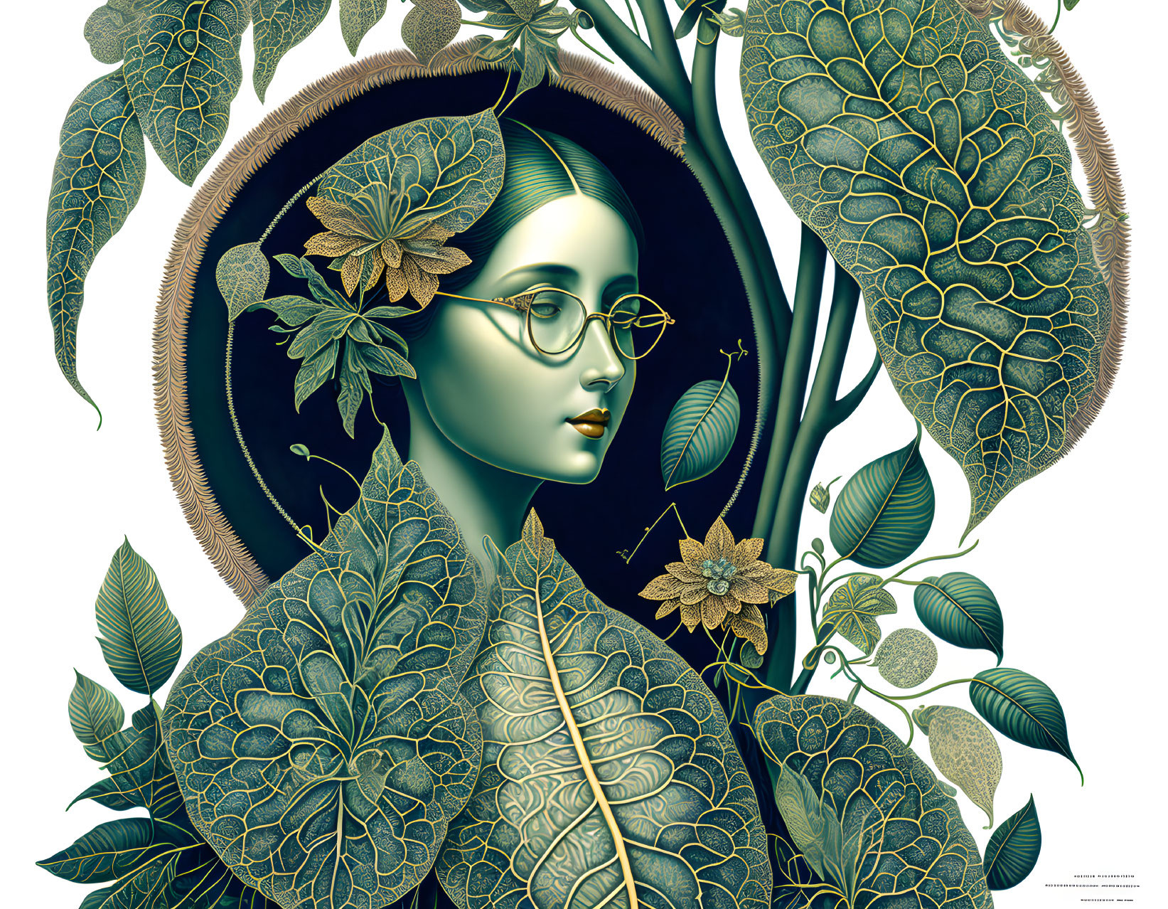 Woman with Glasses Surrounded by Green Foliage on Dark Background