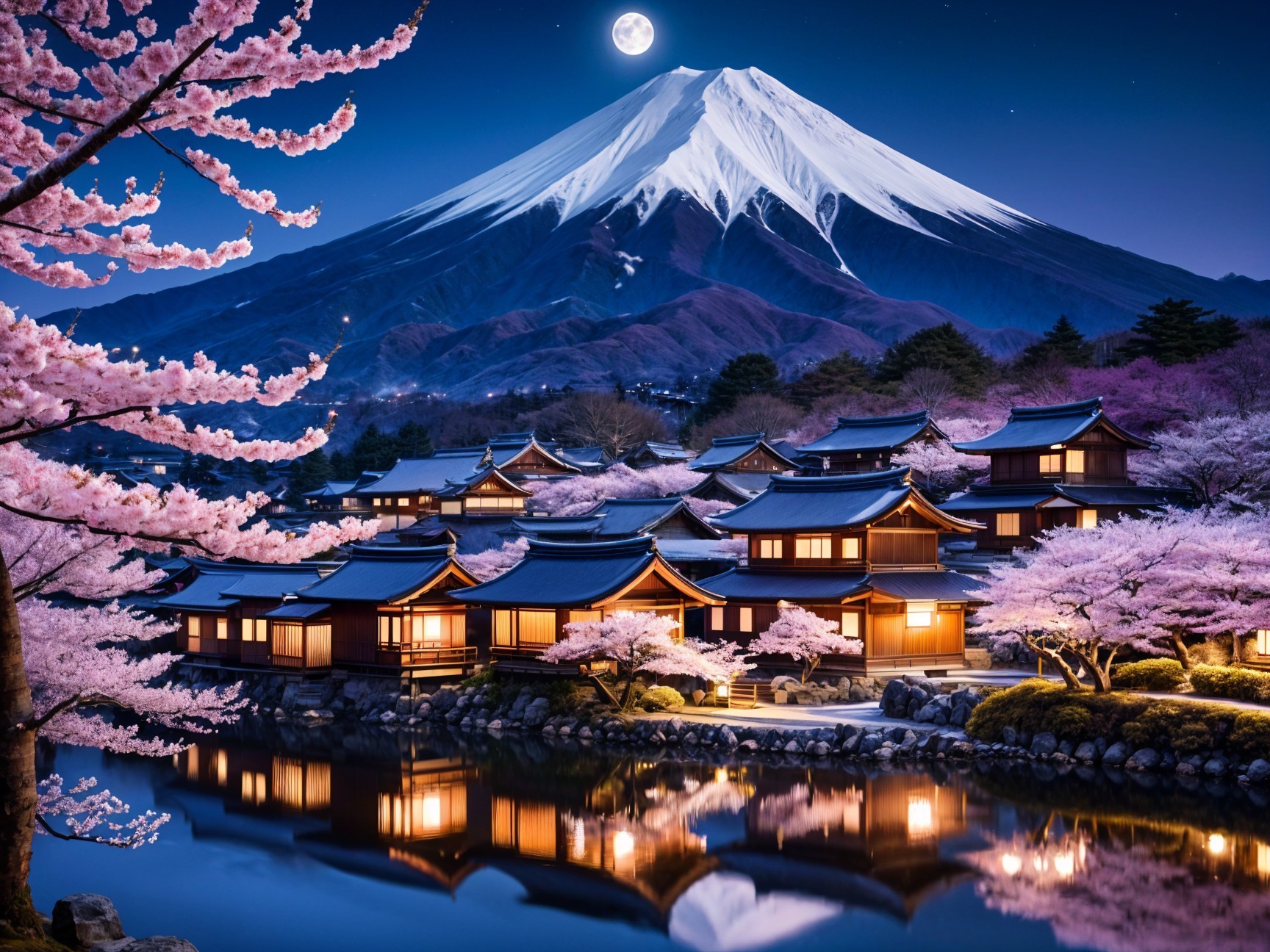 A serene night scene featuring cherry blossoms alongside traditional Japanese houses, reflecting in a calm river, with a majestic mountain and a full moon in the background.