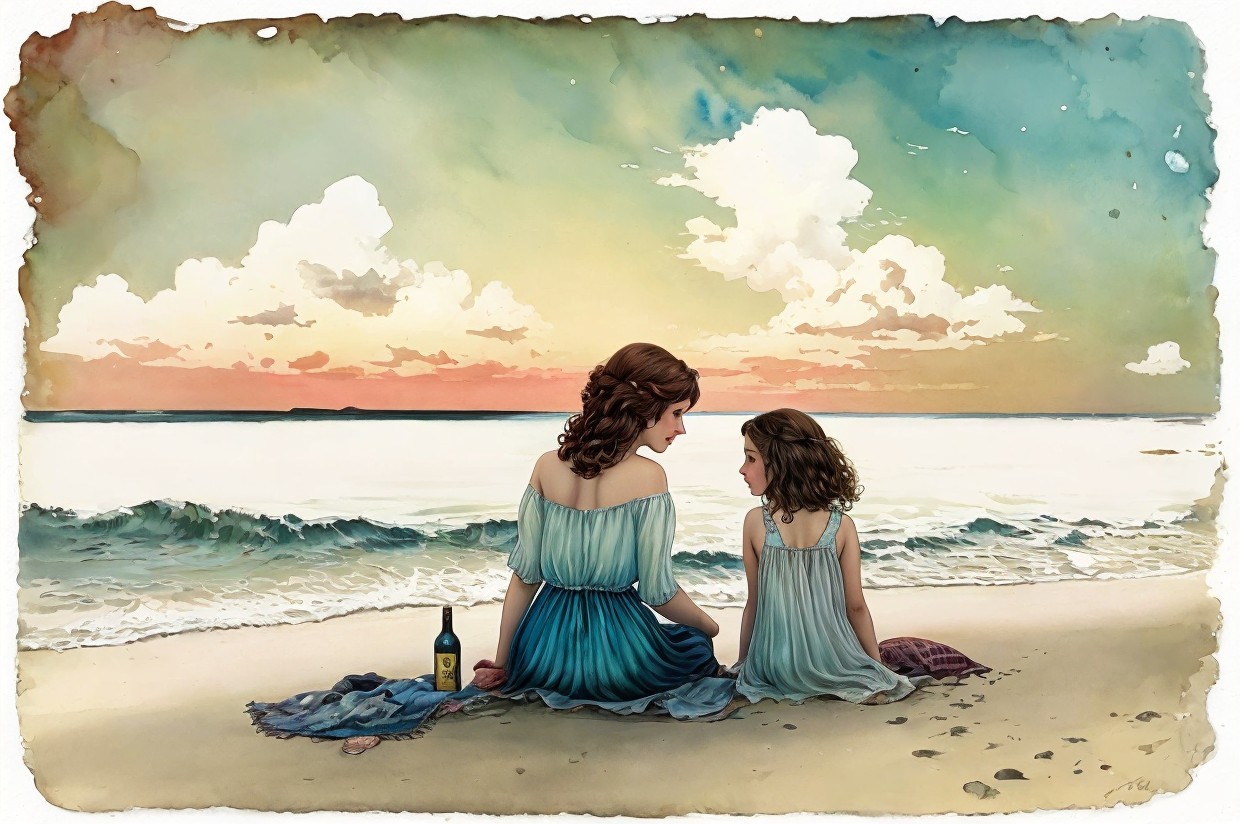 Prompt: "Mother with a girl 10 years old are sitting on the seashore, vintage postcard, alcohol ink, art by Artem Demura, gouache, young Andrew, Frank Kelly Freas, ink, watercolor, sticker, 2d cute, fantasy, dreamy, vector illustration, 2d flat, centered, by Tim Burton, professional, sleek, modern, minimalist, graphic, line art, vector graphics"