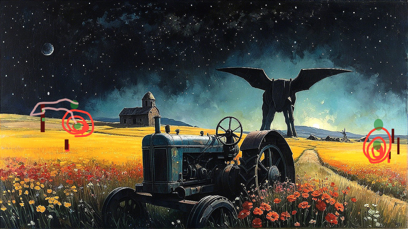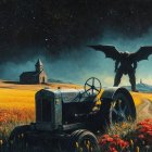 A serene landscape features a vintage tractor in a vibrant flower field, flanked by distant barns under a starlit sky with a crescent moon. An abstract figure looms nearby, enhancing the dreamlike scene.
