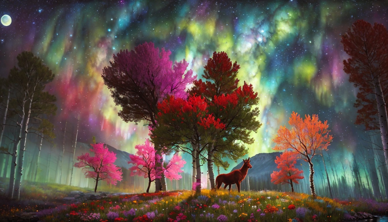+ Prompt:highland red flower spectacular, pines and beautiful aspen trees by a river, cosmic night sky with a full bright large moon and stars, made of mixed media, acryllc, stained glass and metallic paints