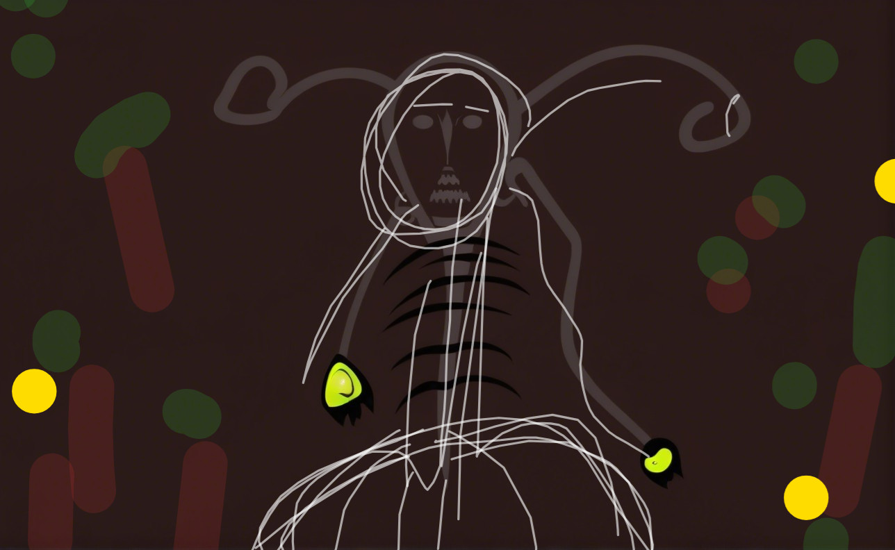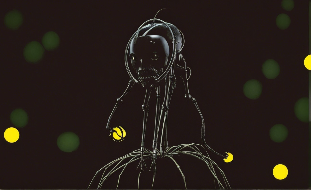 A menacing robotic creature with glowing eyes stands in a dark forest with eerie yellow lights.