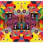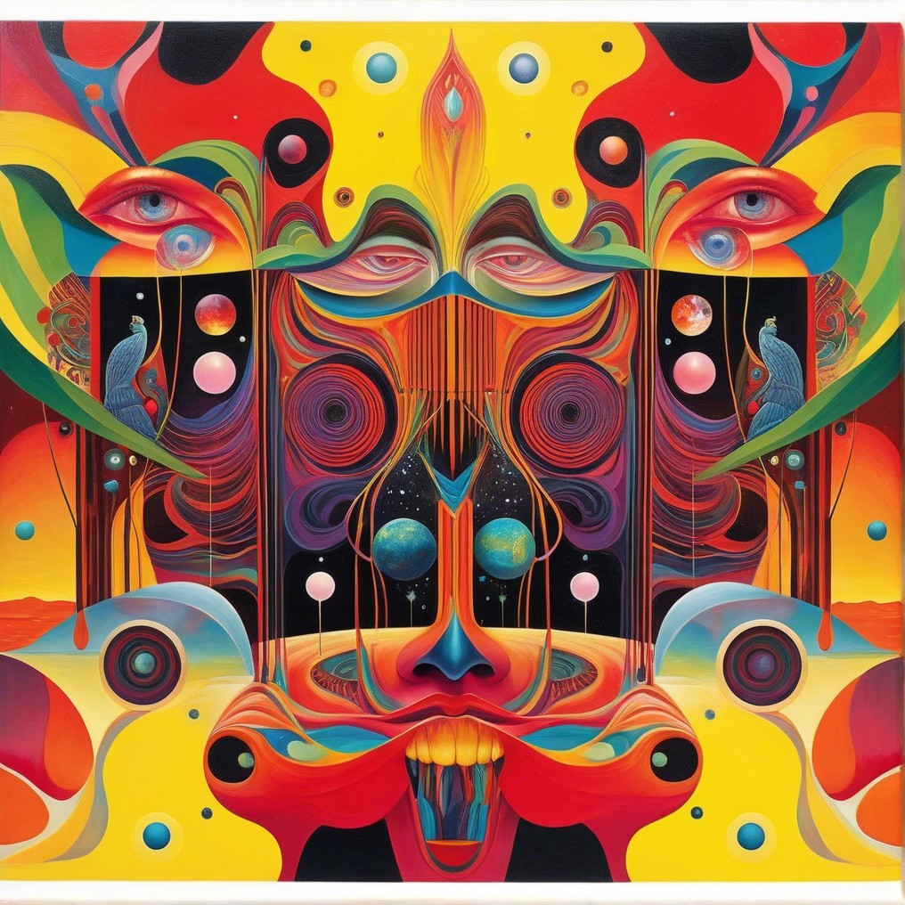 A vibrant, surreal artwork featuring a symmetrical face surrounded by abstract shapes and colors. Elements like planets and geometric forms create a dreamlike, cosmic atmosphere.