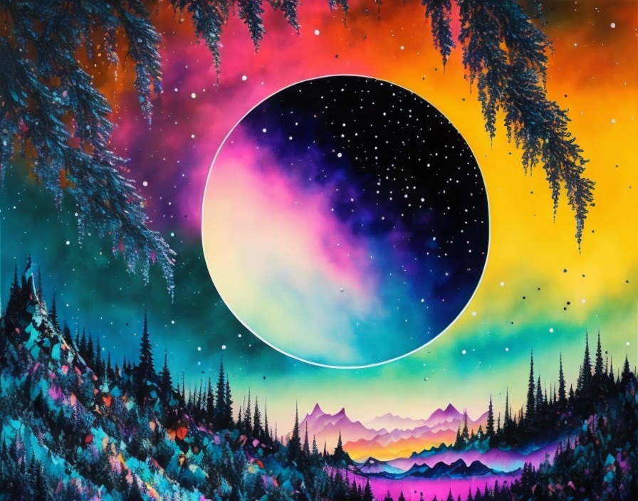 Forest silhouette against cosmic backdrop with mountains and aurora sky