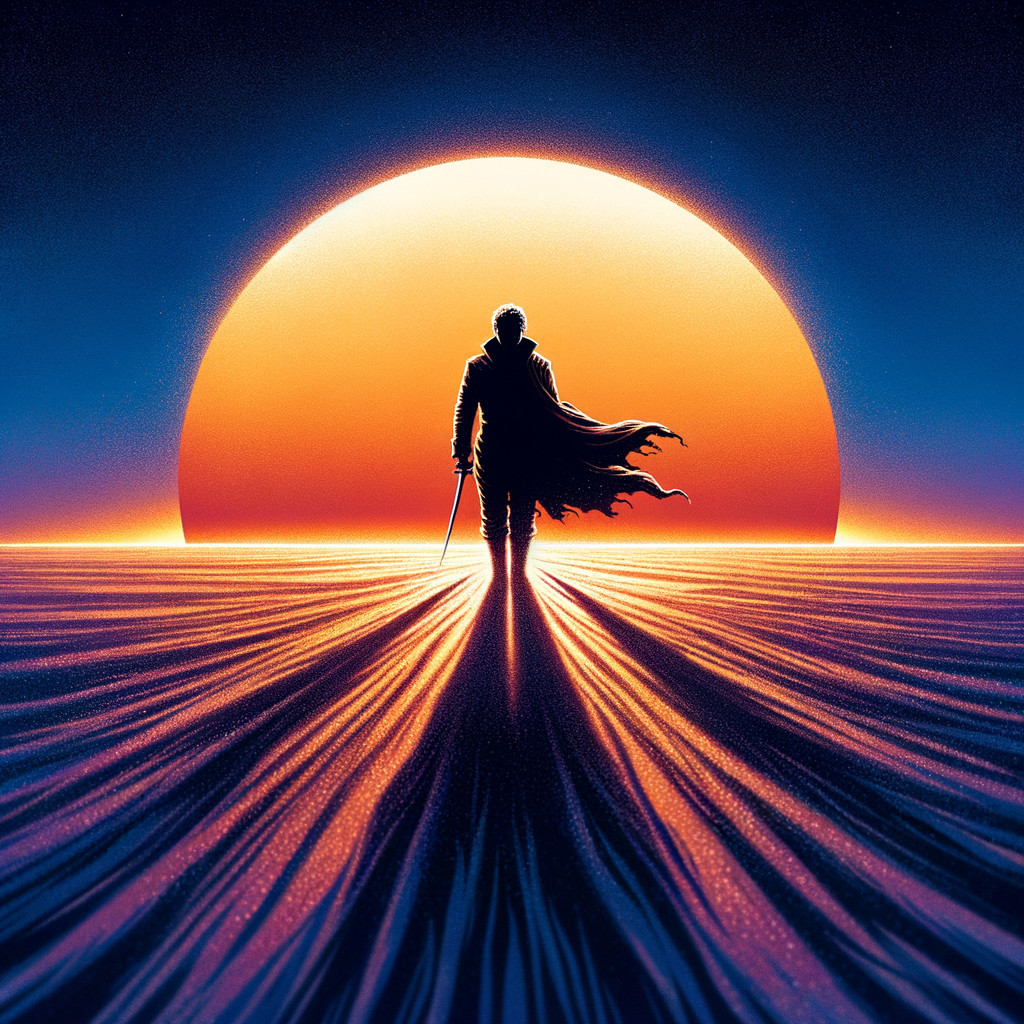 A silhouette stands before a massive sun, casting long shadows on a textured ground, under a twilight sky filled with stars.