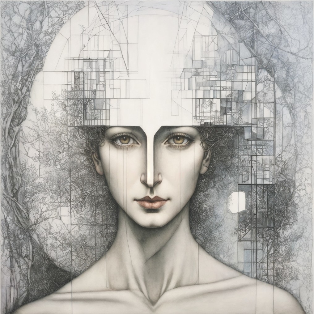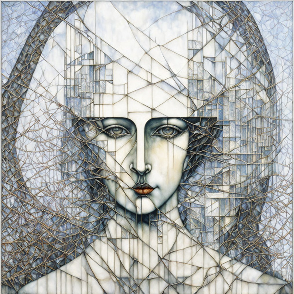 A surreal portrait of a woman whose face merges with architectural elements and a spiderweb-like overlay, blending human and structural features.