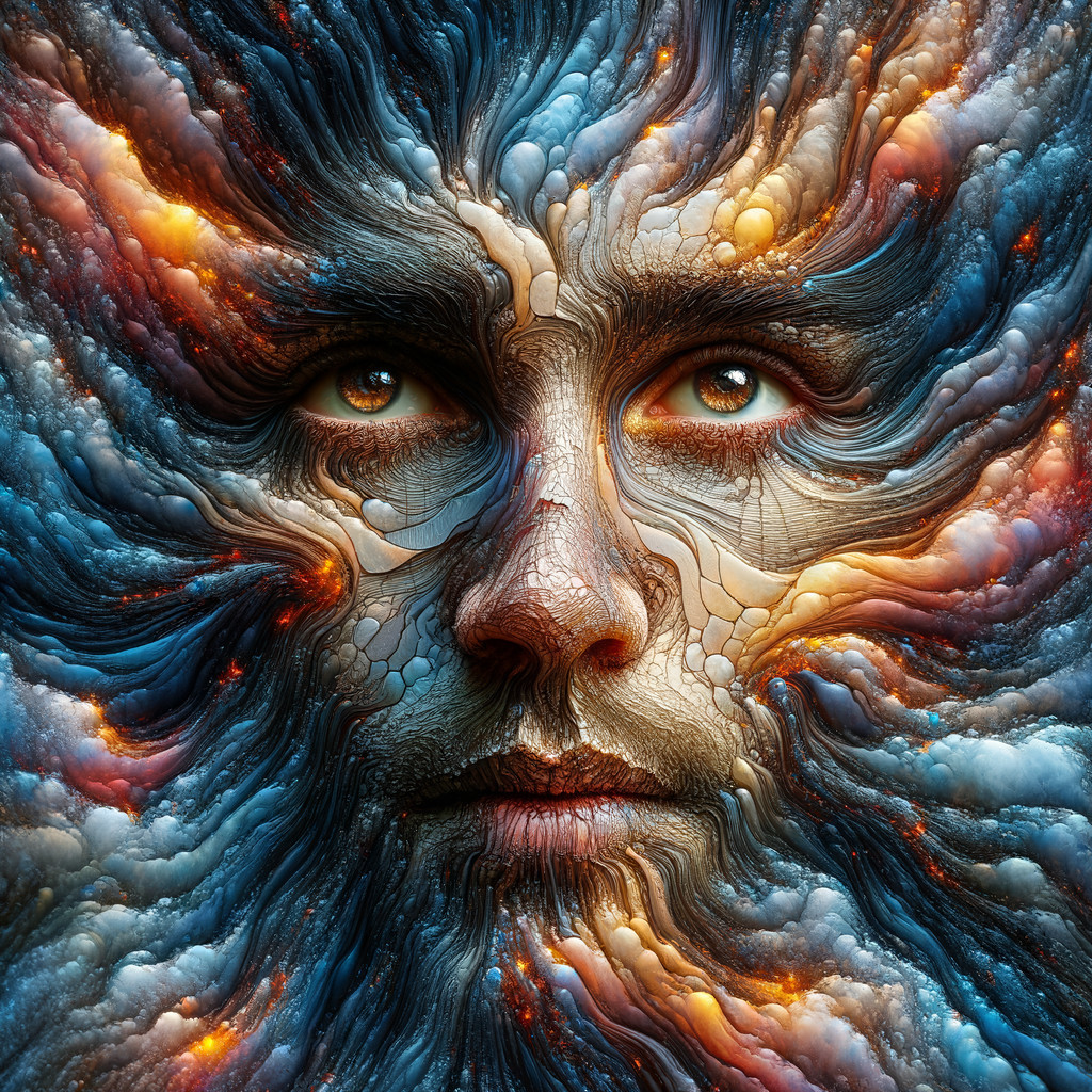 A striking close-up of a woman with intricate, cracked skin and flowing white hair, adorned with delicate, pink orbs. Her expression is ethereal, blending beauty with an otherworldly quality.