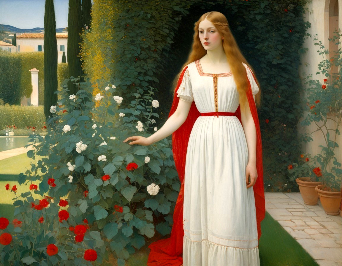 A woman in classical attire stands with her hand on rose bushes in a garden with buildings in the background.