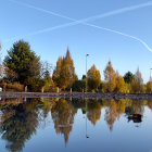 A serene landscape features a calm river reflecting vibrant autumn trees. Above, contrails crisscross a clear blue sky, adding a modern touch to the tranquil scenery.