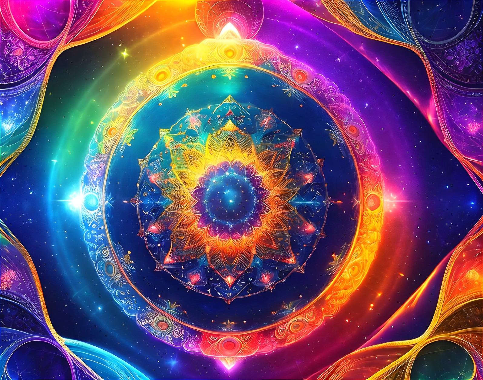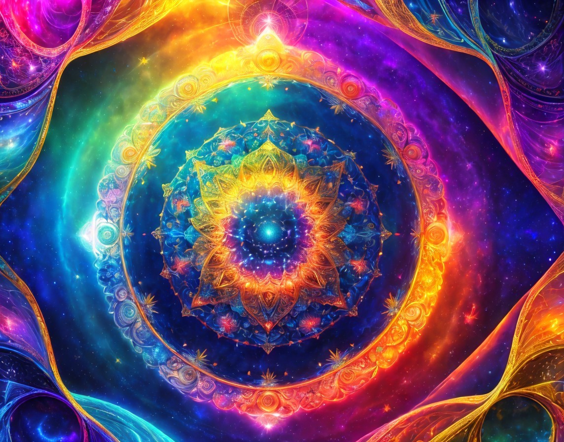 Vibrant Kaleidoscopic Mandala with Cosmic Backdrop