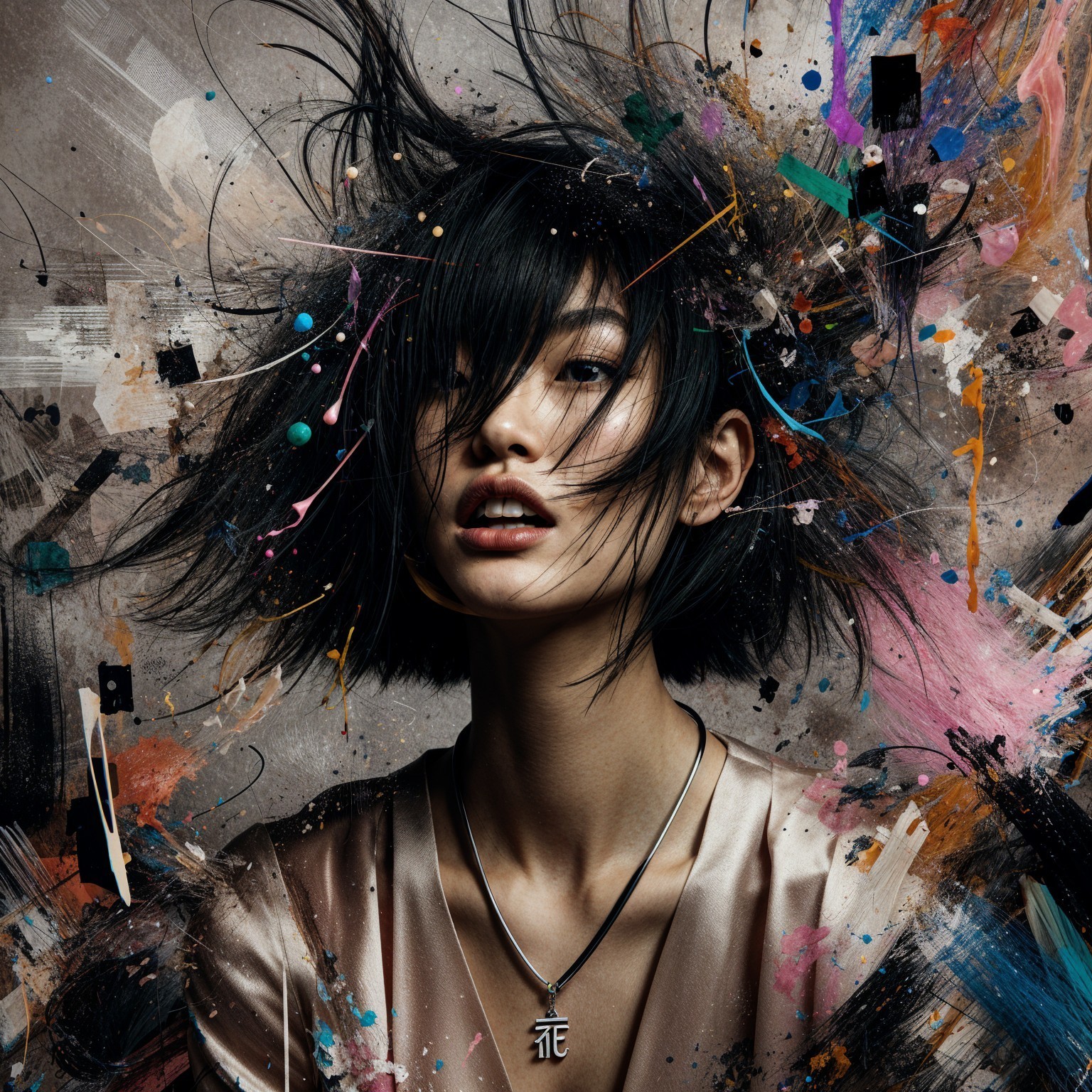Prompt: "An avant-garde, high-energy portrait in the explosive, expressive style of Russ Millis, capturing a young Chinese model in the midst of shaking her head. Her full, luscious lips are slightly parted, exuding both allure and intensity, while her sharp, focused eyes pierce through the chaotic movement around her. Her black hair, styled in a messy, asymmetrical bob, is thrown dramatically in the air as she shakes her head, with multicolored streaks of pink, blue, and gold caught in mid-motion, adding a sense of dynamic fluidity to the scene.
