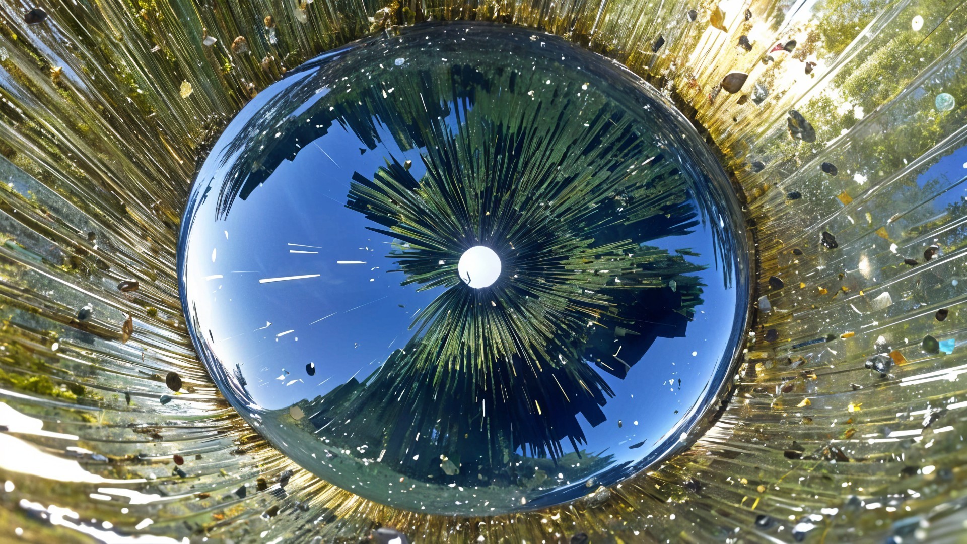 A shimmering, surreal landscape encased in a glassy orb, featuring futuristic buildings and vibrant rays of light. It reflects a mountain backdrop, creating a mesmerizing, dreamlike scene.