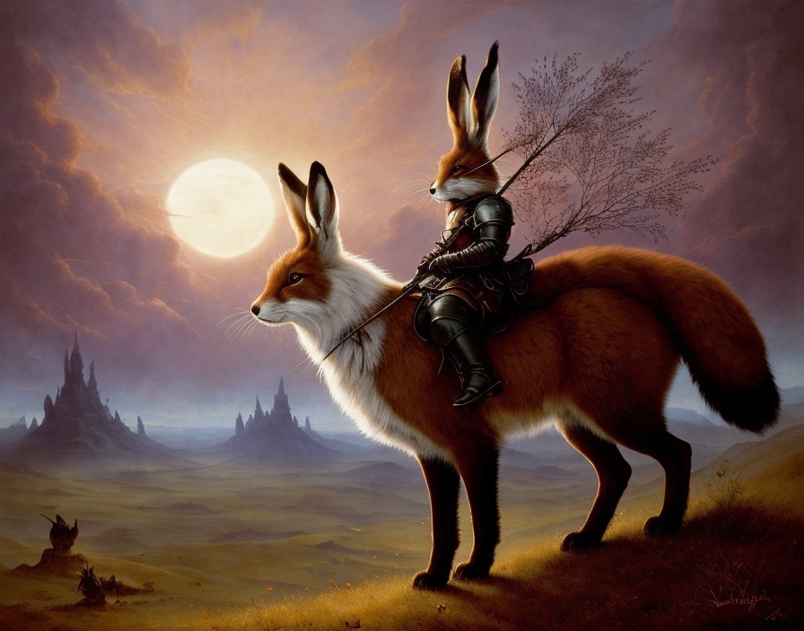 Prompt: close old veteran fluffy magic hare-knight charging riding on back of heavy war carnivorous red fox, surrealistic fantasy landscape, early sunset tones, will-o-wisps, high definition by Durer, Raphael, Arkhip Kuindzhi, Delacroix, Bosch; botanic surrealistic fantasy painting; ink watercolor art, extreme detail, oil on canvas, soft brush strokes