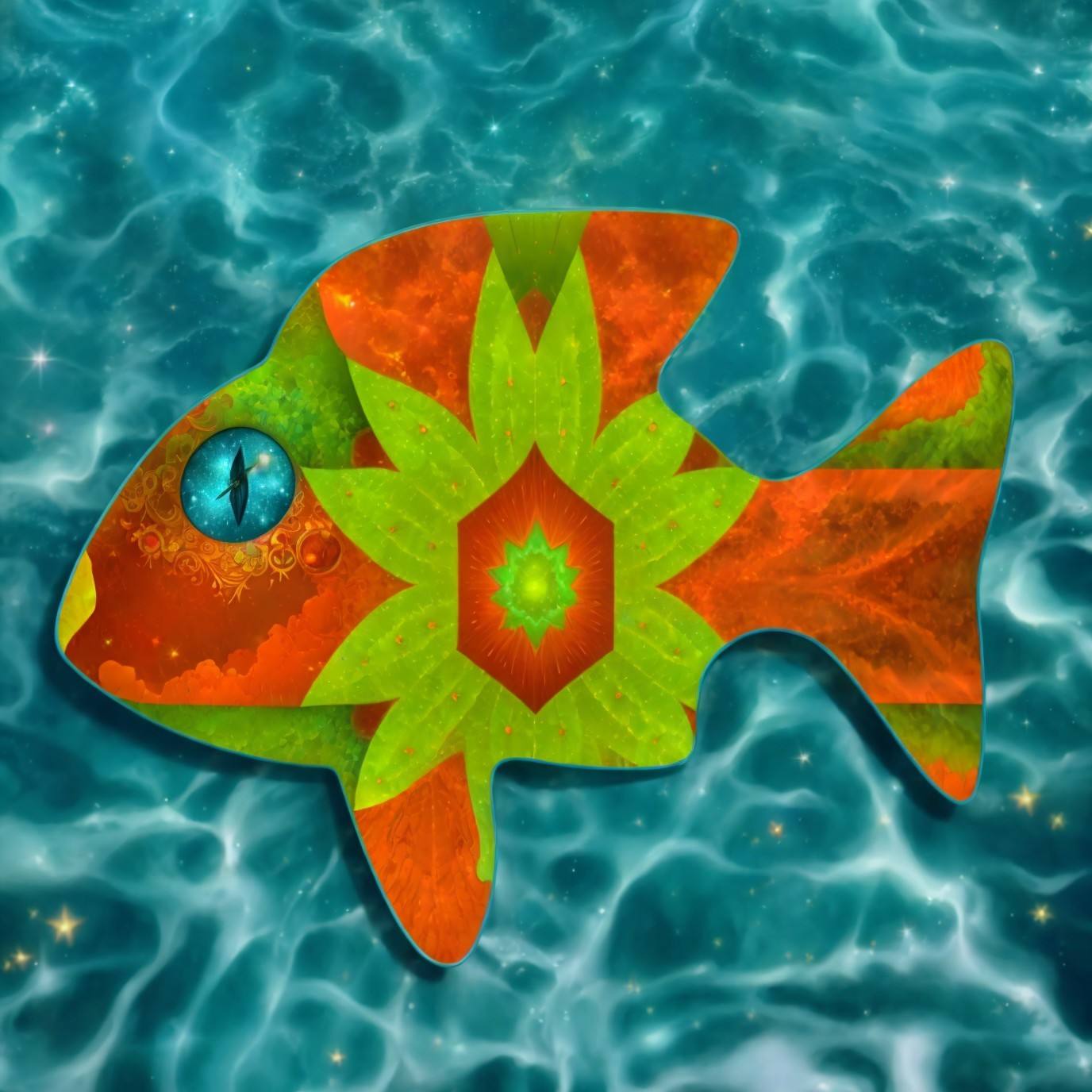 Digital art, red yellow gold, fantasy fish, way, path, ultra-detailed composition, floating objects, intricate details, patterns, incredible landscape incredible, unearthly view, starlight, gas aura, abstraction, magic, style by Scott Bergey, Schim Schimmel, Tim Burton