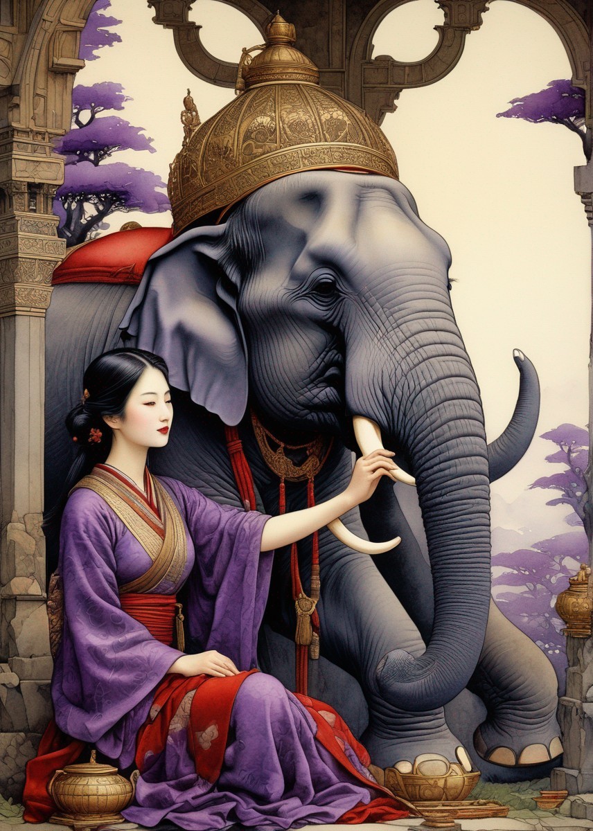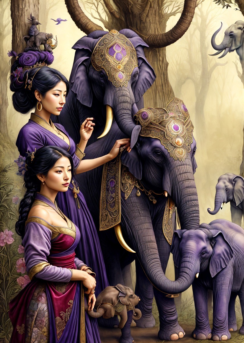 Beautiful woman tending the elephants. Medieval Japanese Artists Sumi-e Style, purple, indigo, Ruby red, Velvet Black, Shabby, Dull Gold, Amber Gray, Golden Ratio, Surreal Fantasy, Elegant, High Definition Ultra Fine 3D Line, Zenangle Style, Watercolor Patchwork , Arthur Rackham Style, Paul Kidby, , Jacek yerka, Extremely Detailed, Intricate, Thoughtful, HDR, Fractal, Beautiful, Award Winning, Fantasy Look, Fantasy, Crisp Quality