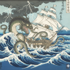 A majestic ship battles turbulent waves, while a fierce dragon emerges from the stormy skies, its scales shimmering. The scene is a blend of adventure and fantasy, showcasing nature's might.