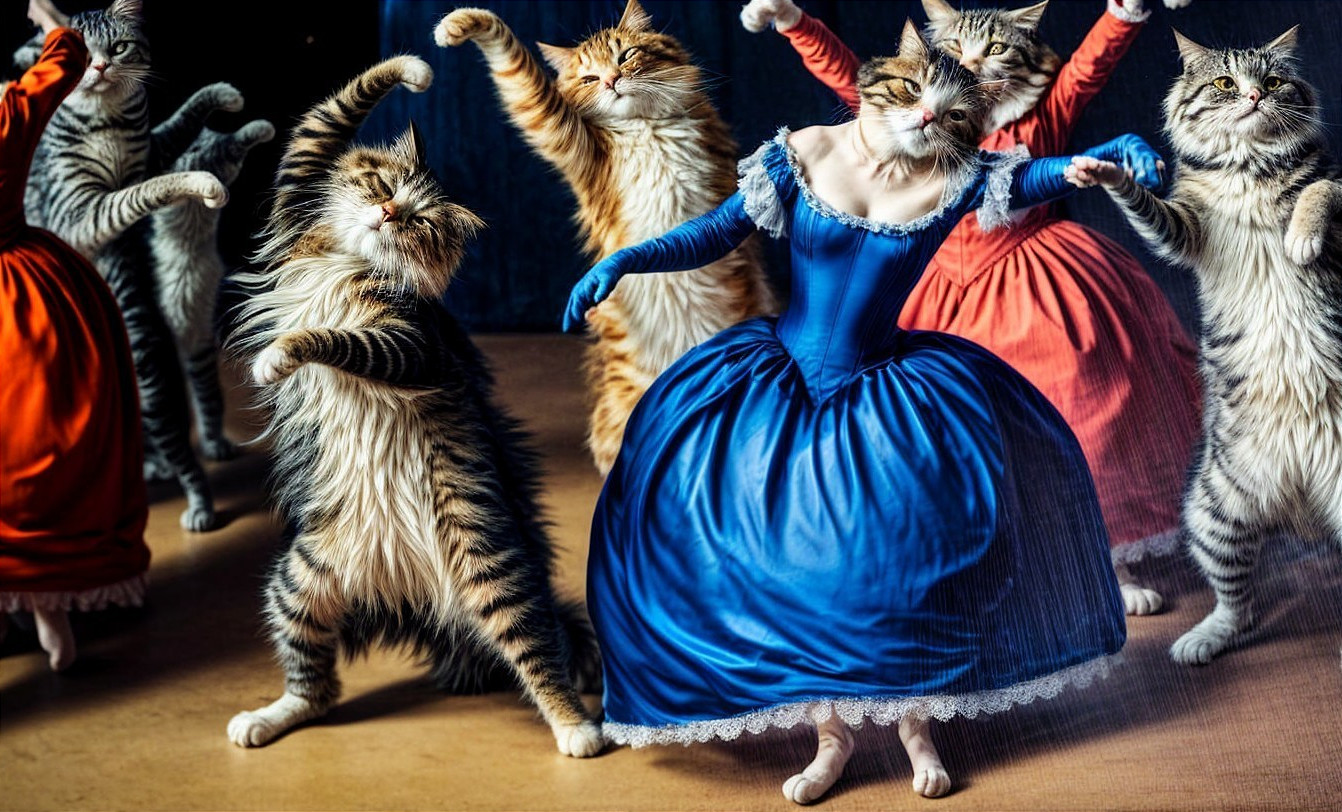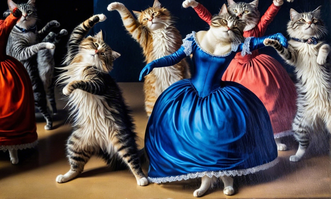 (Try from Lily Pearl) - The image features anthropomorphic cats dressed in elegant attire, dancing in a playful, whimsical setting, reminiscent of a fantasy or storybook scene.