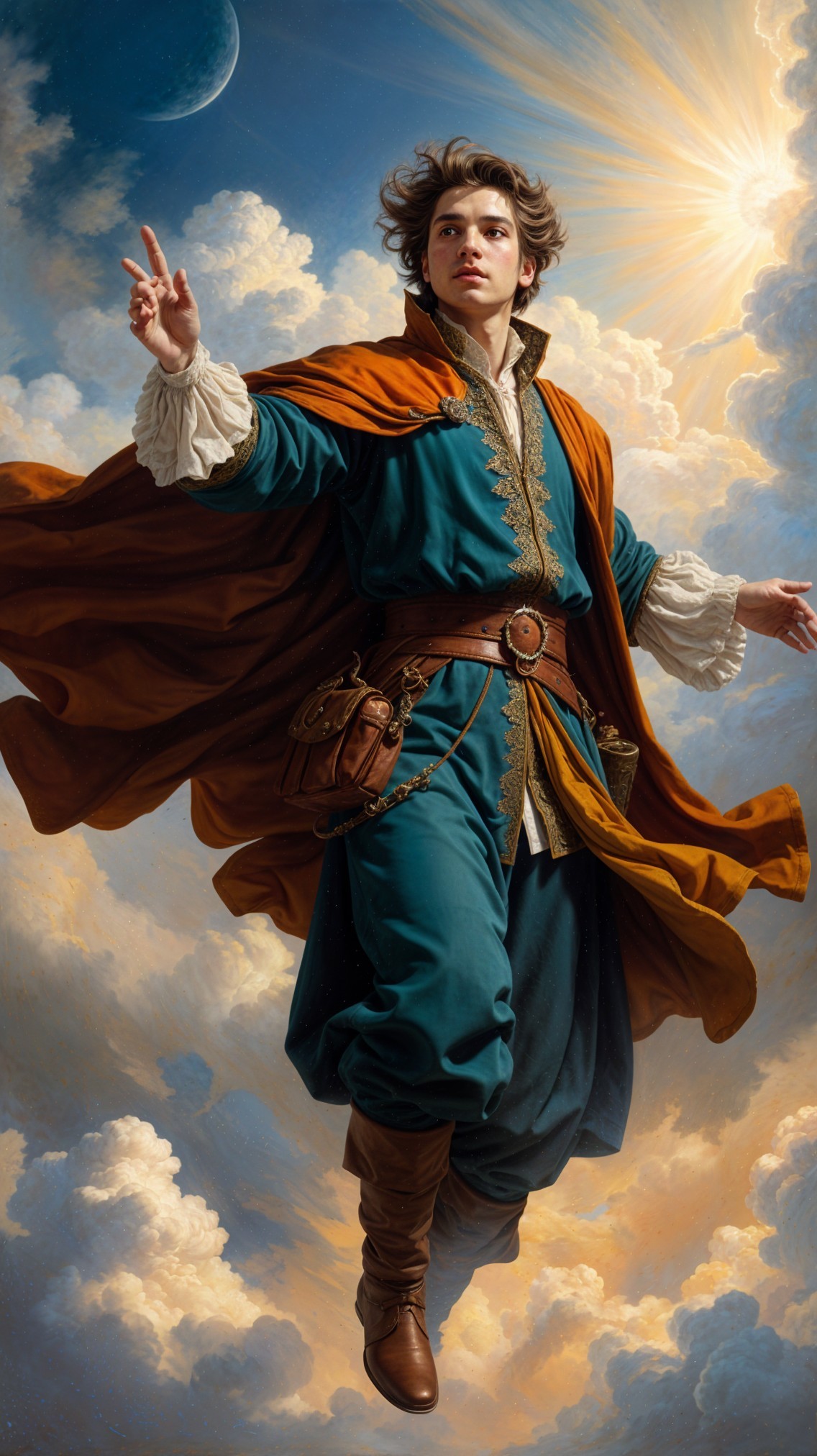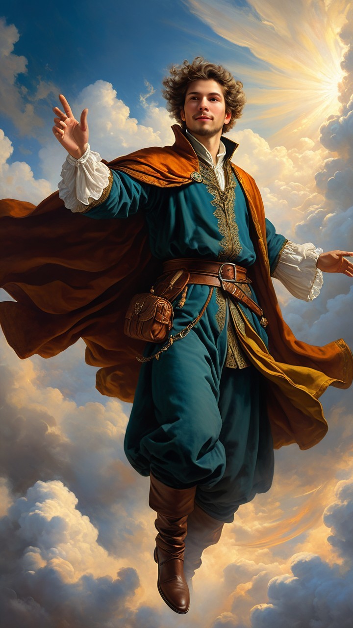 A young man in a vibrant blue and orange outfit, soaring through a cloudy sky. He wears a flowing cape and has a confident expression, with doves flying around him, adding a sense of freedom.
