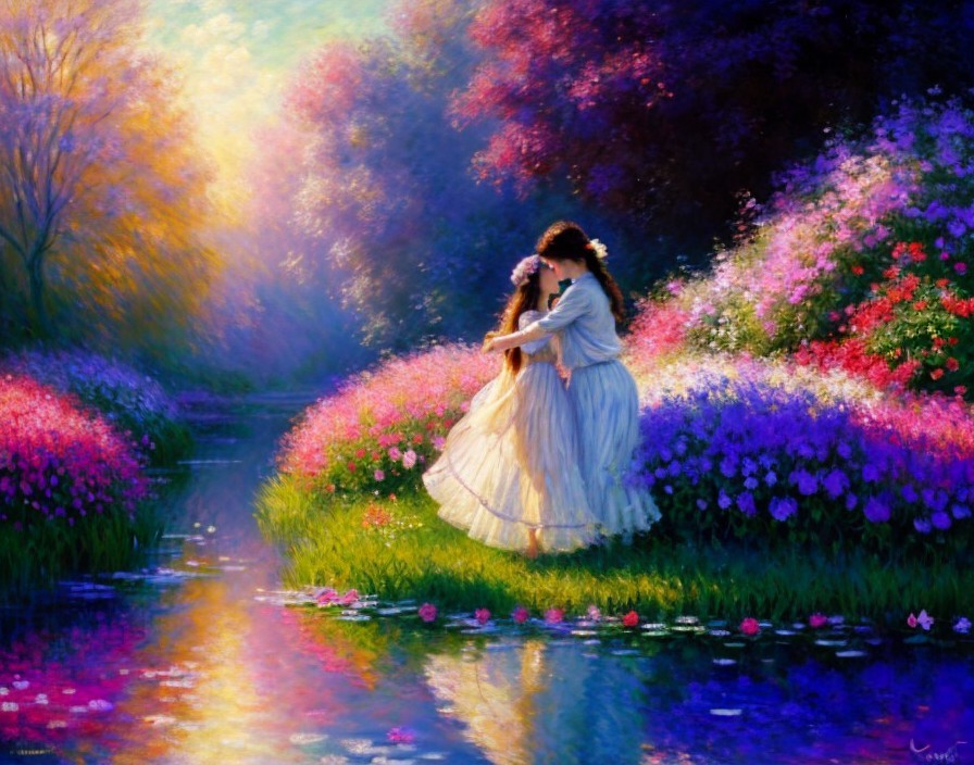 In the style of Claude Monet, create a painting that captures the essence of love's energy through the dance of light and color. Imagine a tranquil garden at the peak of spring, where every petal seems to whisper secrets of affection.