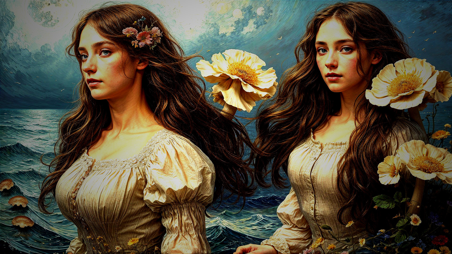 A stunning, hyper-realistic illustration captures a woman soaring through a vibrant ocean filled with mushrooms and jellyfish at sunset. The artwork blends intricate details and muted colors, evoking a dreamy, cinematic atmosphere.