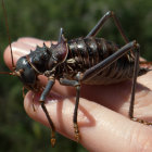 A person gently holds a large, dark brown cricket on their palm, surrounded by lush green vegetation. The insect's details, such as its long antennae and textured body, are clearly visible.