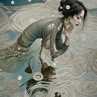 A graceful figure in traditional attire leans thoughtfully among swirling clouds, adorned with delicate flowers, capturing a serene and ethereal beauty in soft pastel tones.