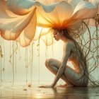 Her love is the light and the heat,A delicate hyper-realistic figure of a fair skin toned woman crouches beneath a towering flower, its broad petals arching above her like a shelter from unseen rain. Her body appears semi-transparent, revealing the gentle movement of water within, as if life itself flows through her veins. Her hair is interwoven with strands of nature hyper textured vines, roots, delicate mosses and petals merging seamlessly, forming a living tapestry that binds her to the earth. Soft diffused light filters through the delicate soft pale colors, an art medium made from powdered pigment petals, casting muted reflections across her translucent form. The surrounding ground shimmers with dew, while faint ripples spread outward from where she kneels, suggesting harmony between the figure and her environment. Rendered in a surreal naturalist style reminiscent of fine botanical illustration blended with photorealism, the composition conveys quiet unity, renewal, and introspection, a visual meditation on the connection between body and nature.