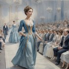 A graceful woman stands in a serene garden at dawn, adorned in a flowing gown. Surrounded by blooming roses and a gentle fountain, she embodies elegance and tranquility.