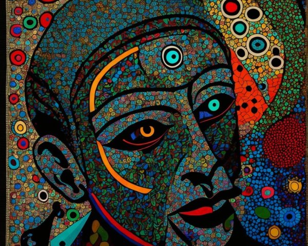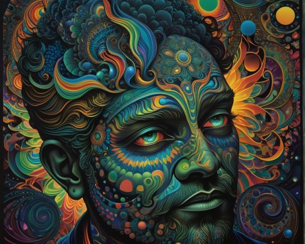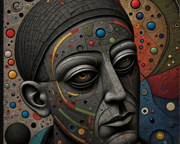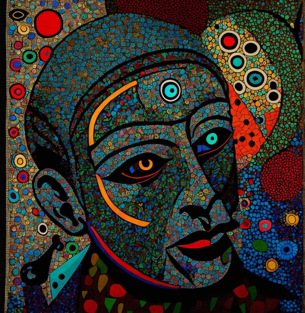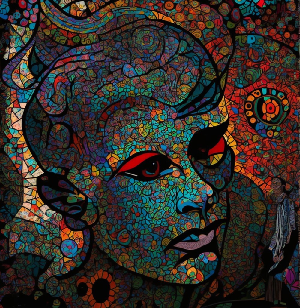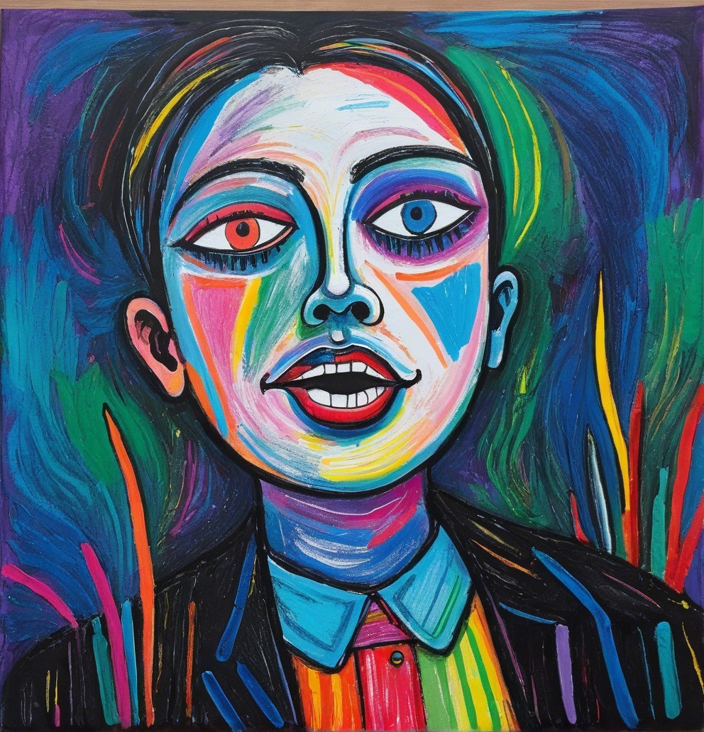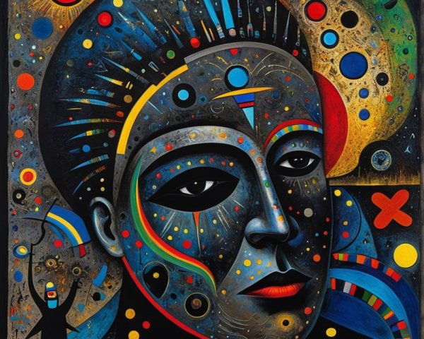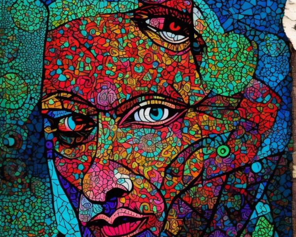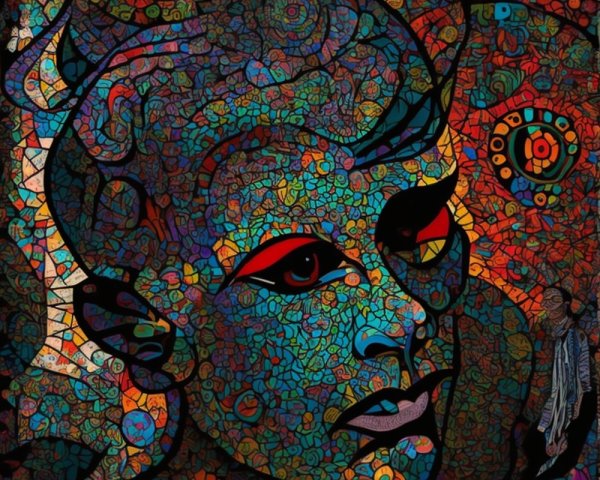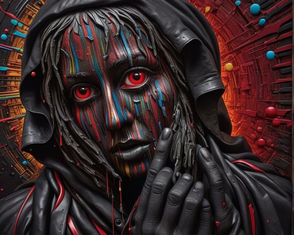 The image features a striking figure with long, textured hair, vibrant red eyes, and a dark hood. Surrounding the figure is an abstract, colorful background that enhances its surreal presence.