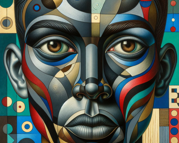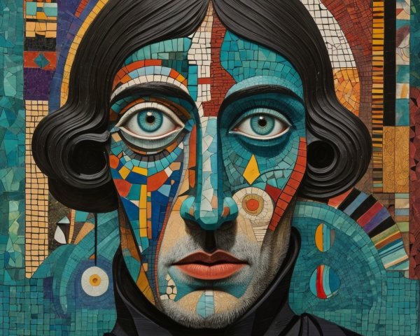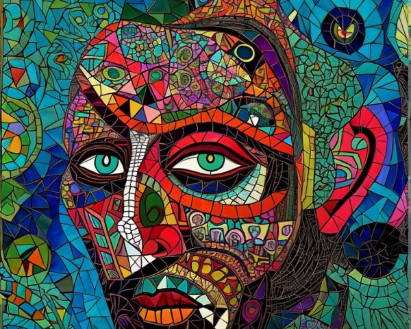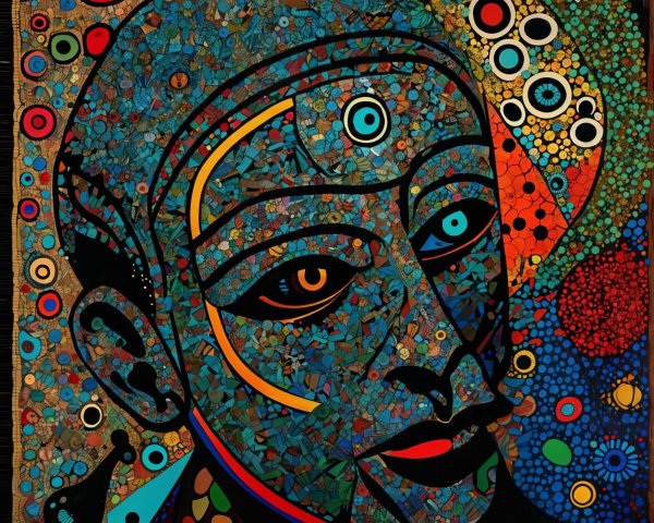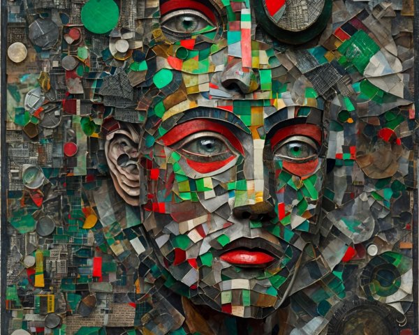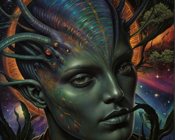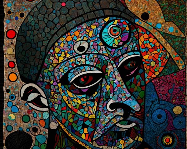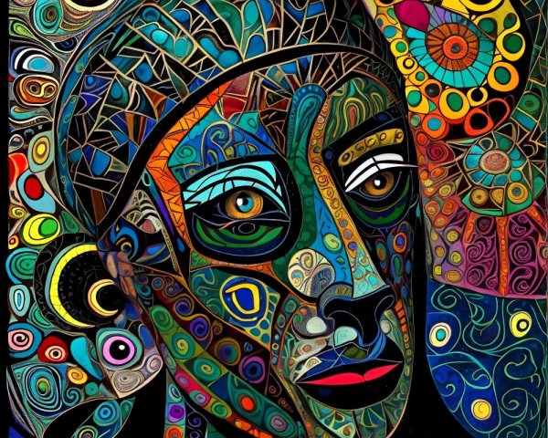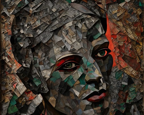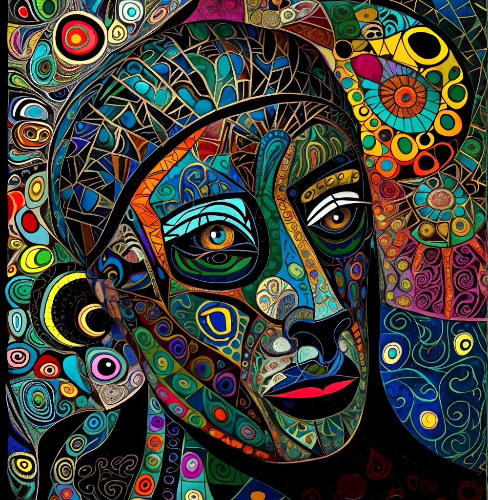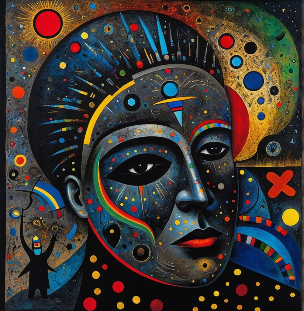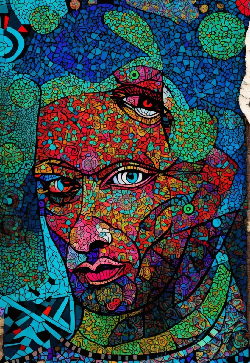 The image features a striking figure with long, textured hair, vibrant red eyes, and a dark hood. Surrounding the figure is an abstract, colorful background that enhances its surreal presence.