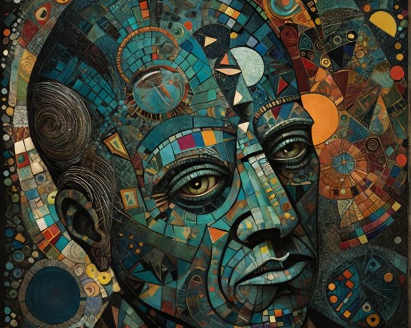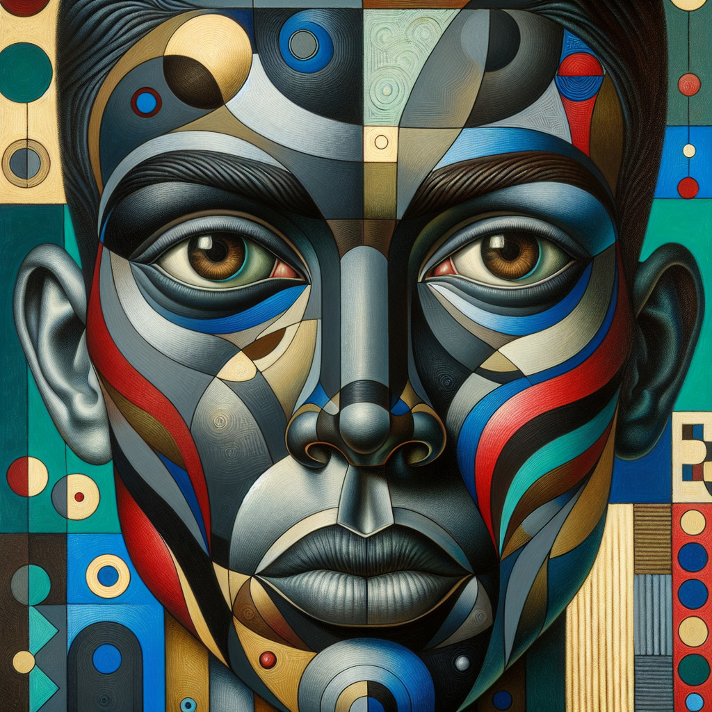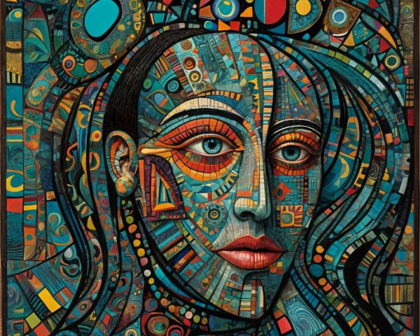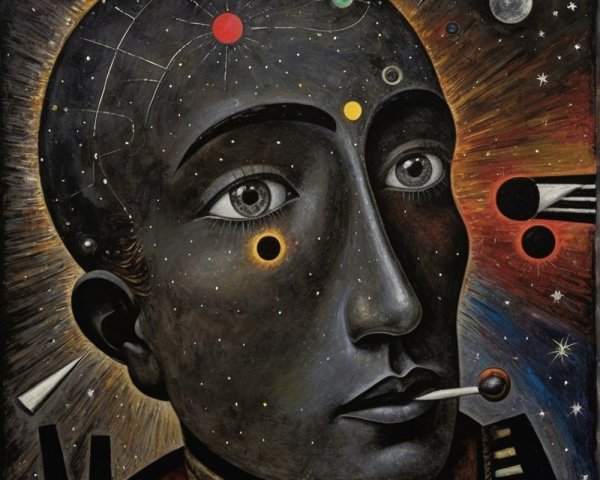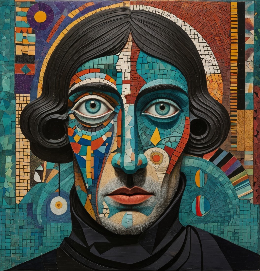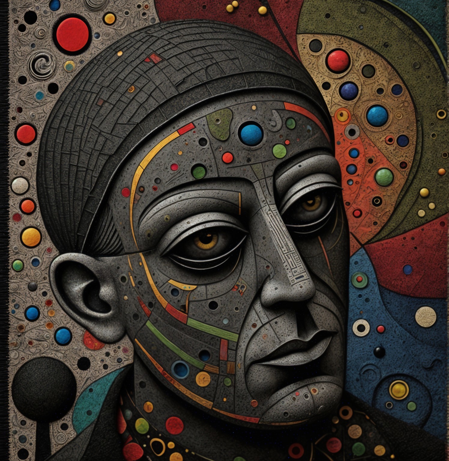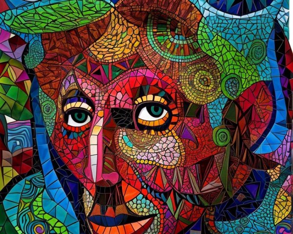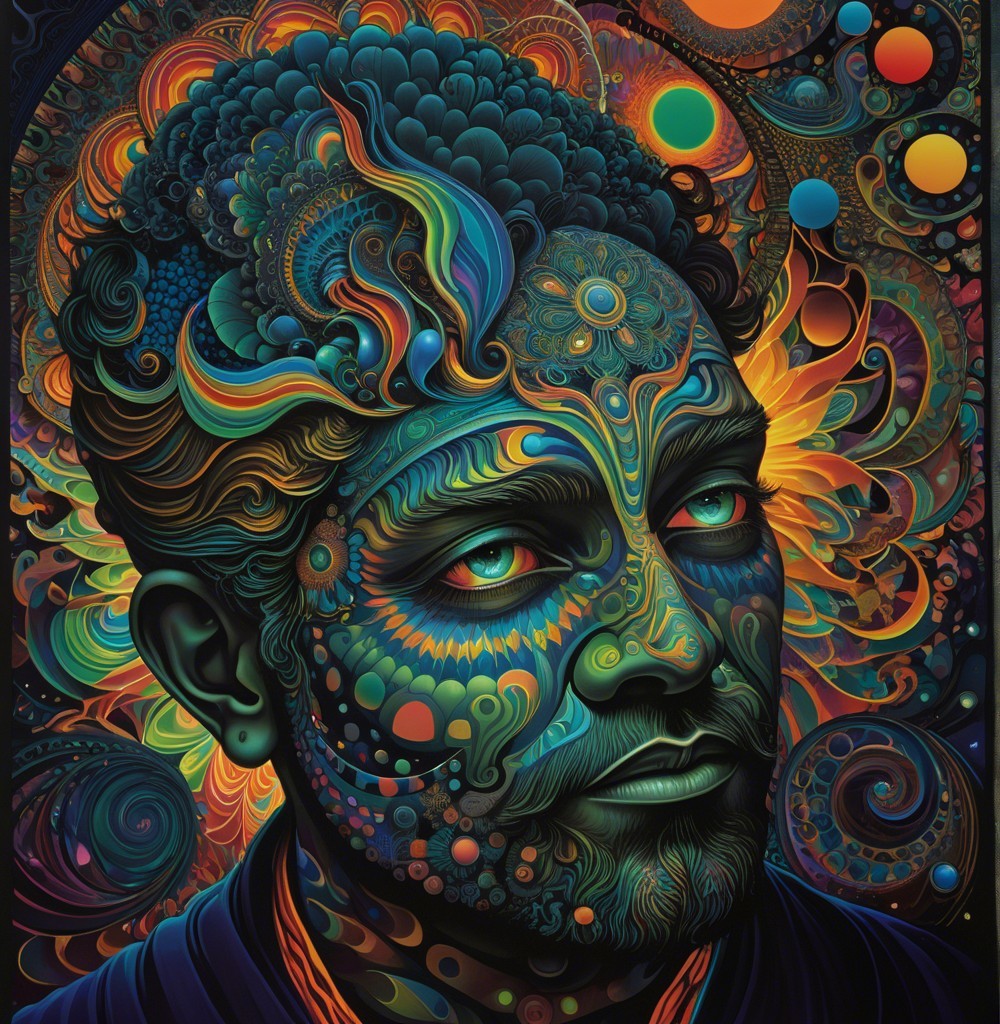 The image features a striking figure with long, textured hair, vibrant red eyes, and a dark hood. Surrounding the figure is an abstract, colorful background that enhances its surreal presence.