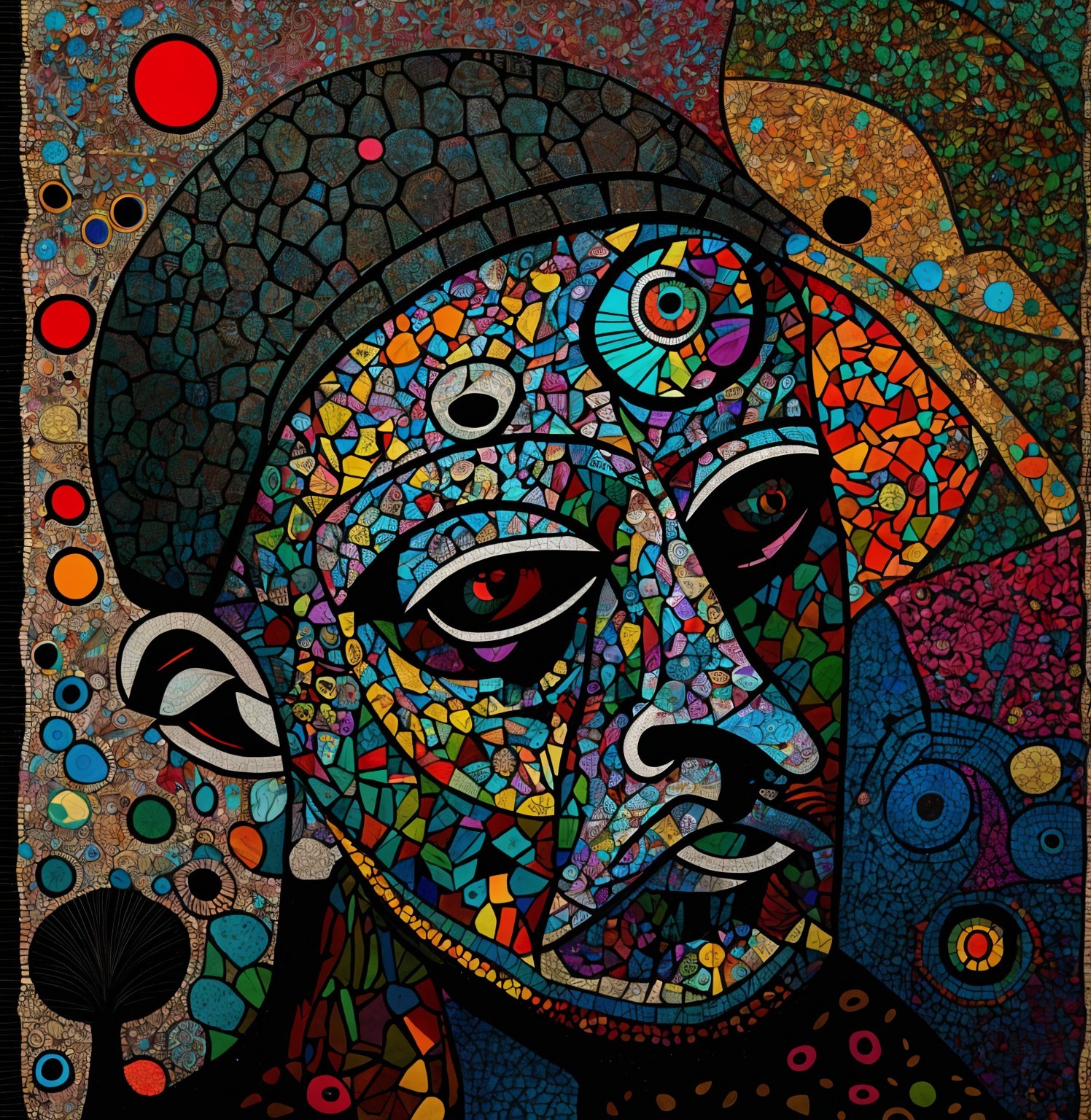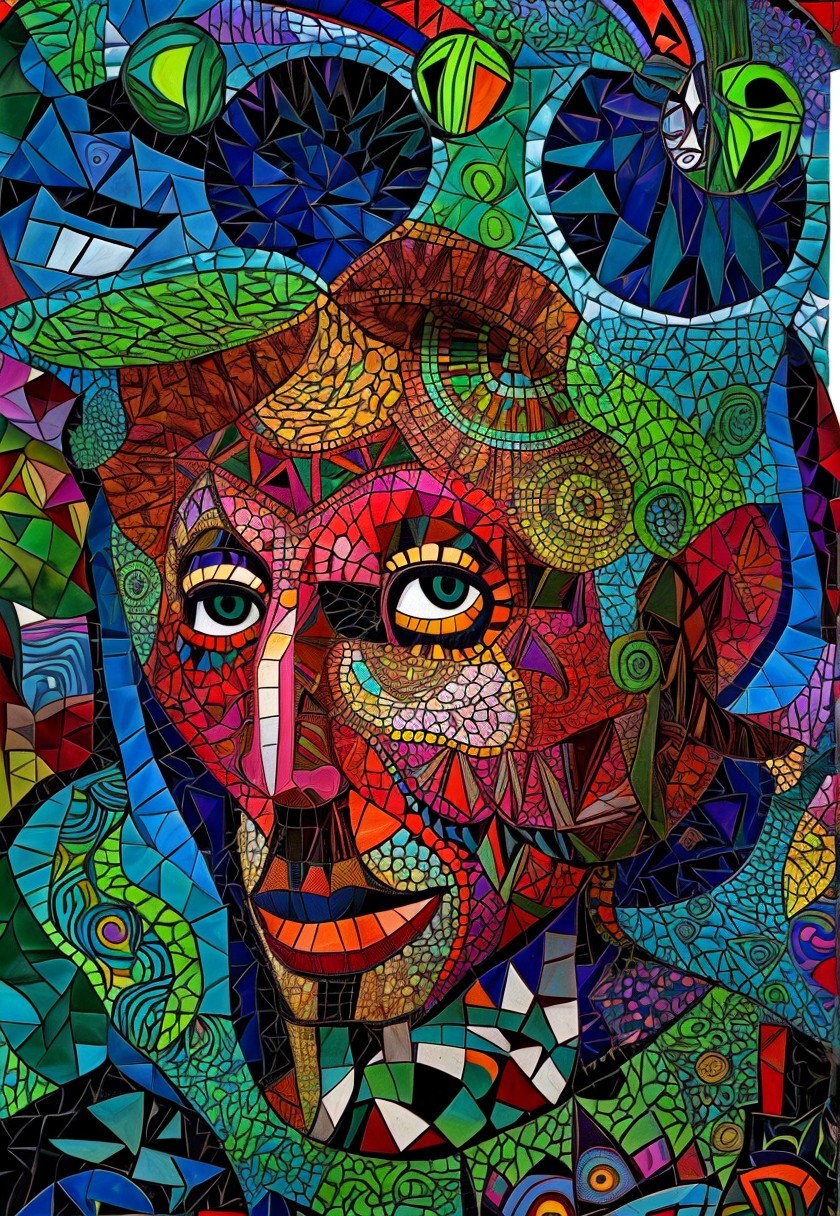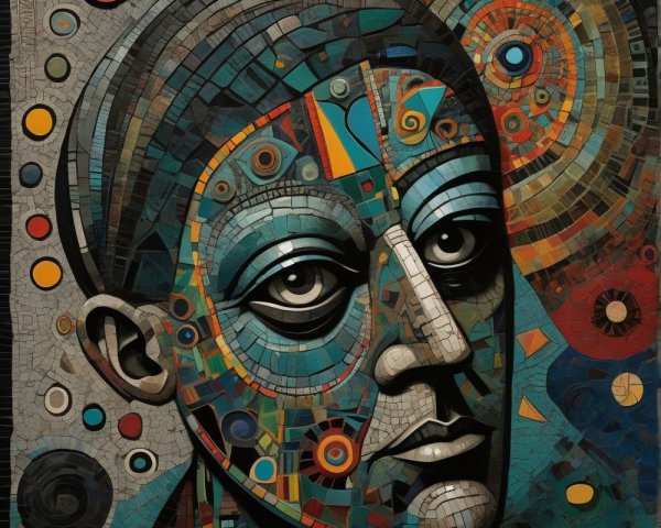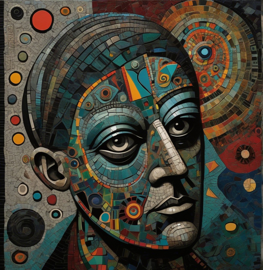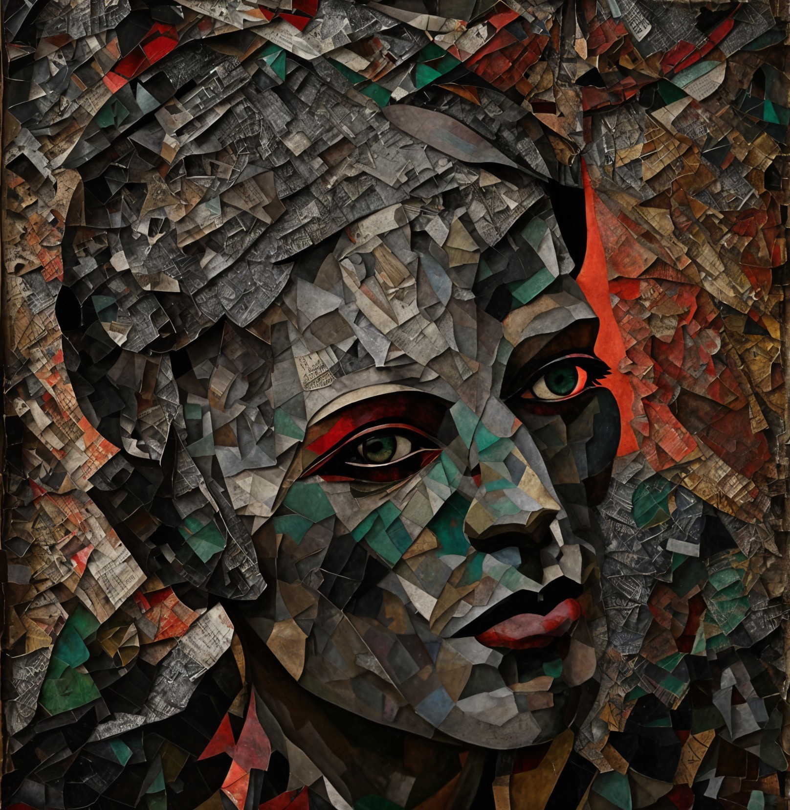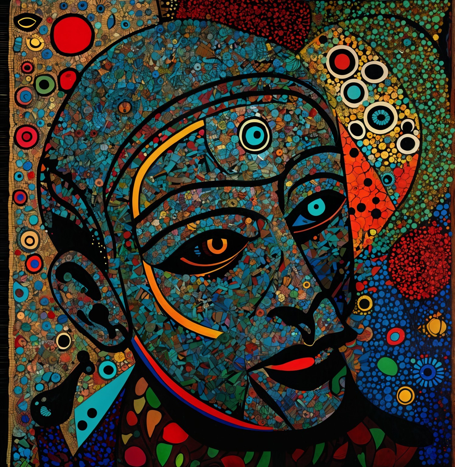 The image features a striking figure with long, textured hair, vibrant red eyes, and a dark hood. Surrounding the figure is an abstract, colorful background that enhances its surreal presence.