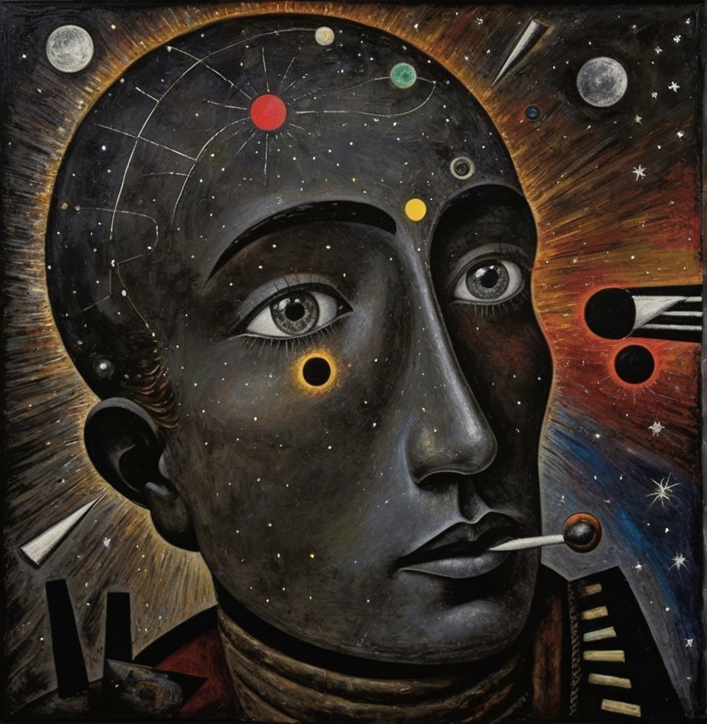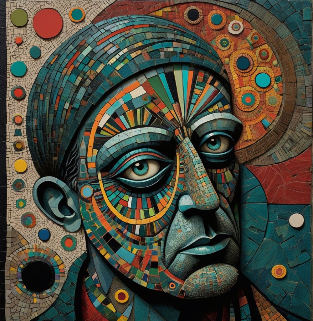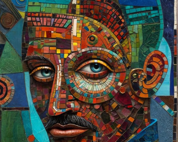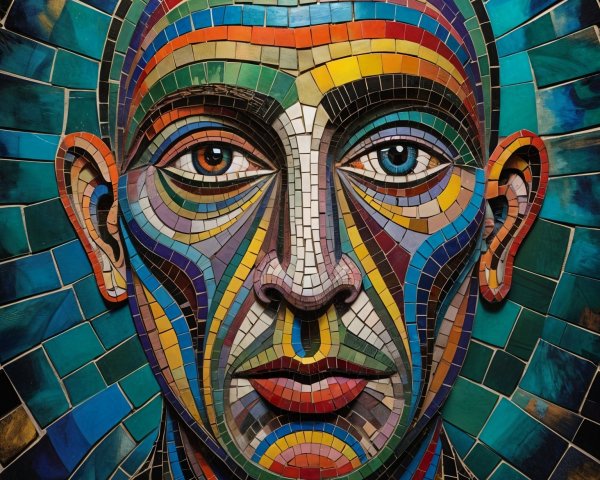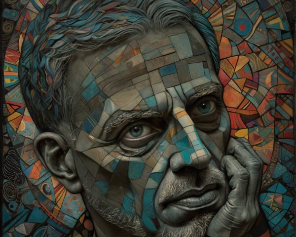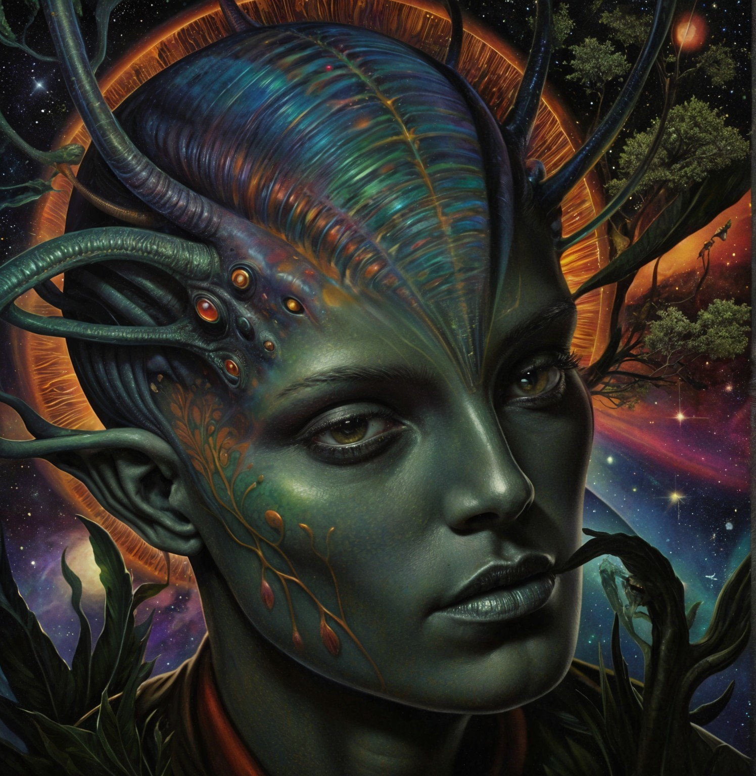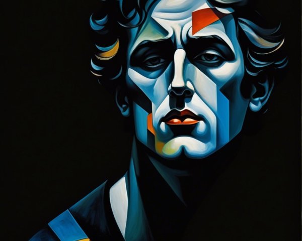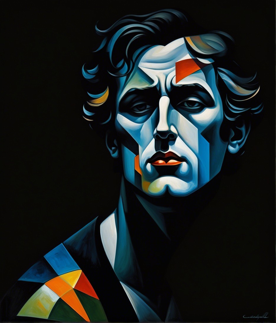 The image features a striking figure with long, textured hair, vibrant red eyes, and a dark hood. Surrounding the figure is an abstract, colorful background that enhances its surreal presence.