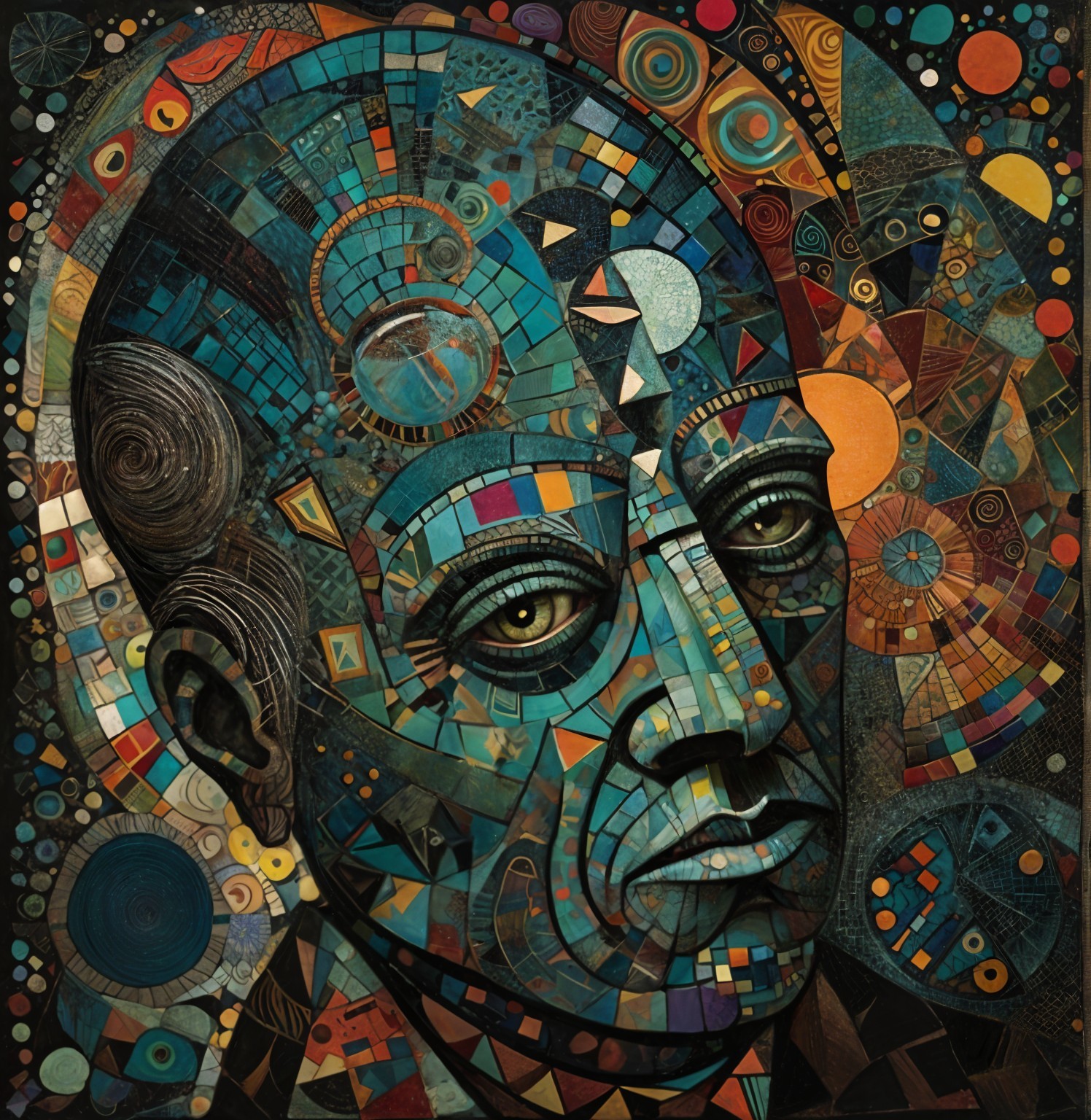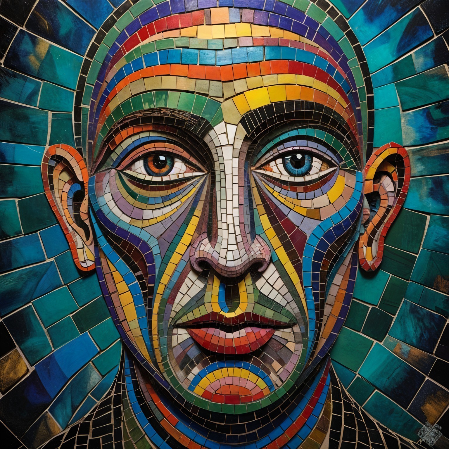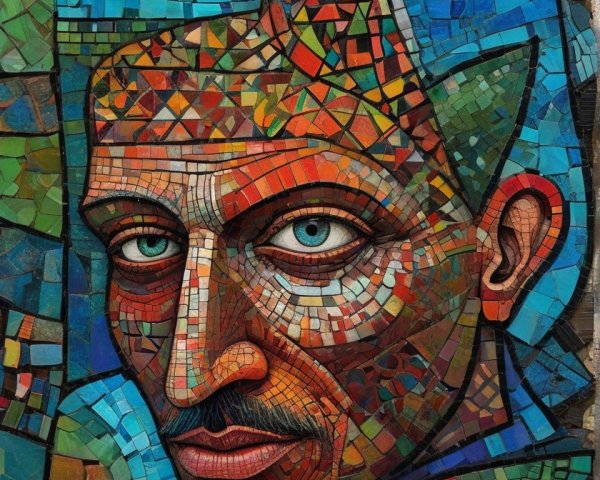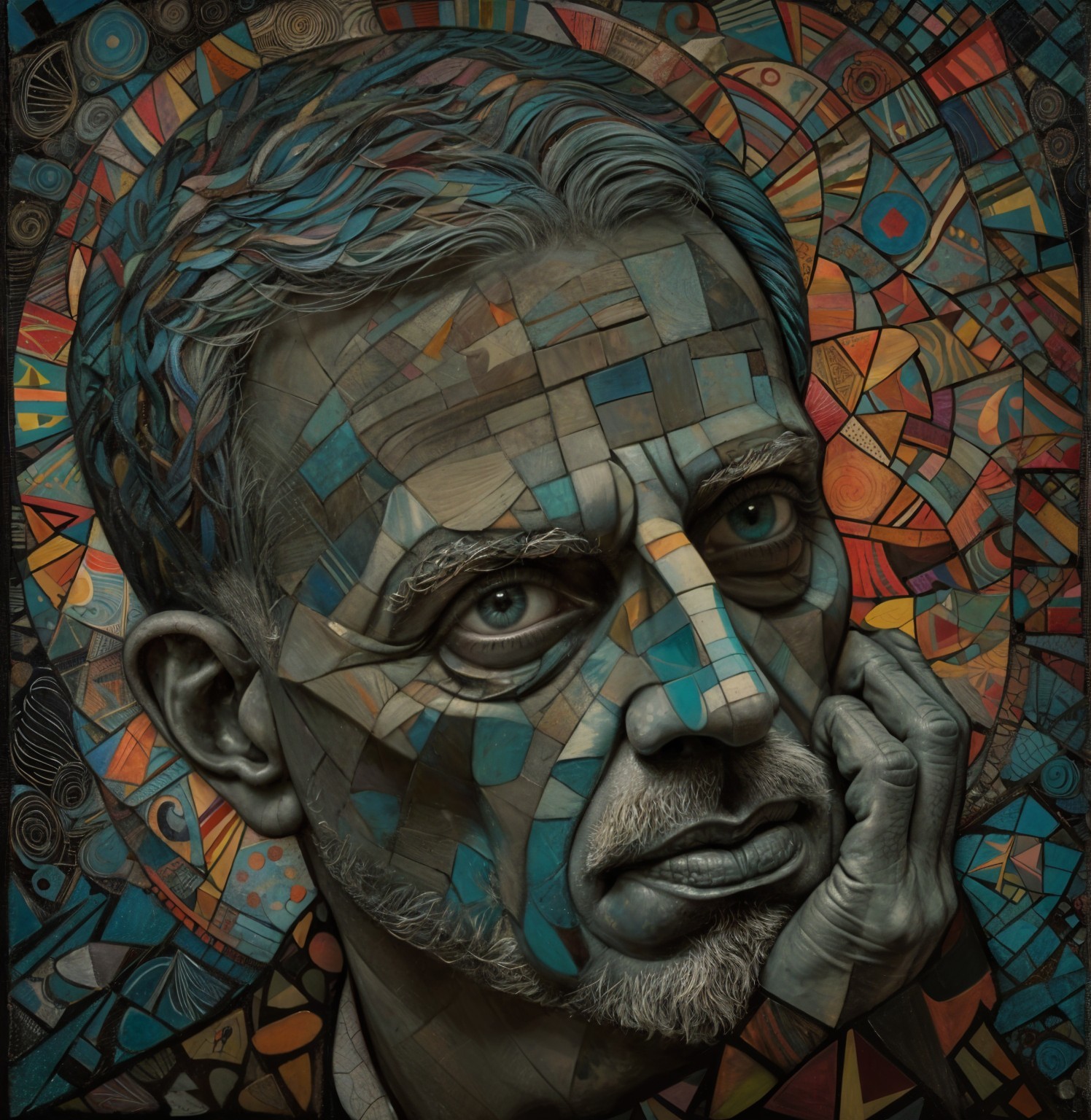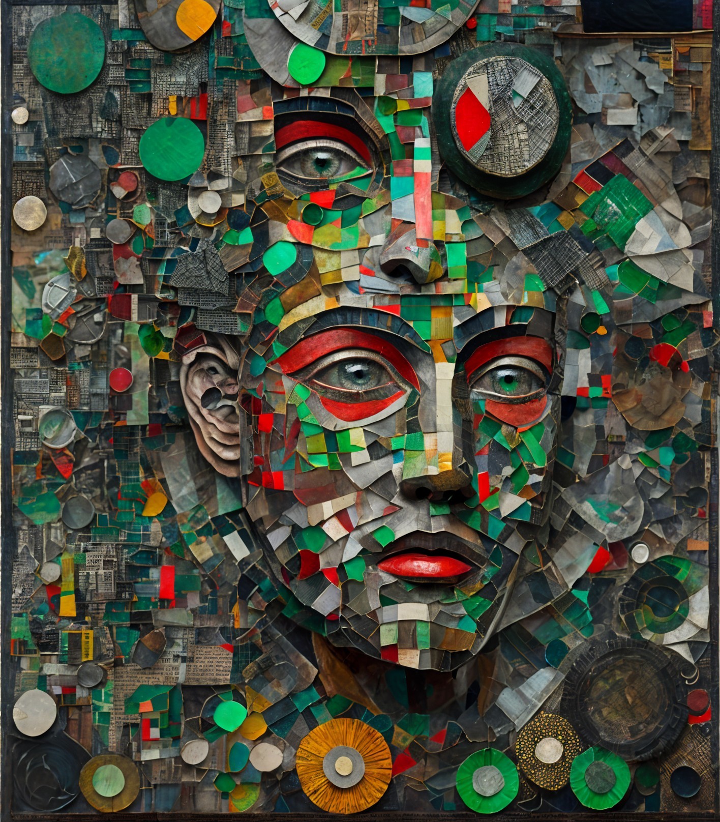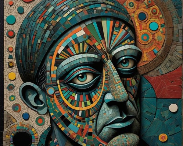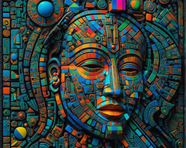 The image features a striking figure with long, textured hair, vibrant red eyes, and a dark hood. Surrounding the figure is an abstract, colorful background that enhances its surreal presence.