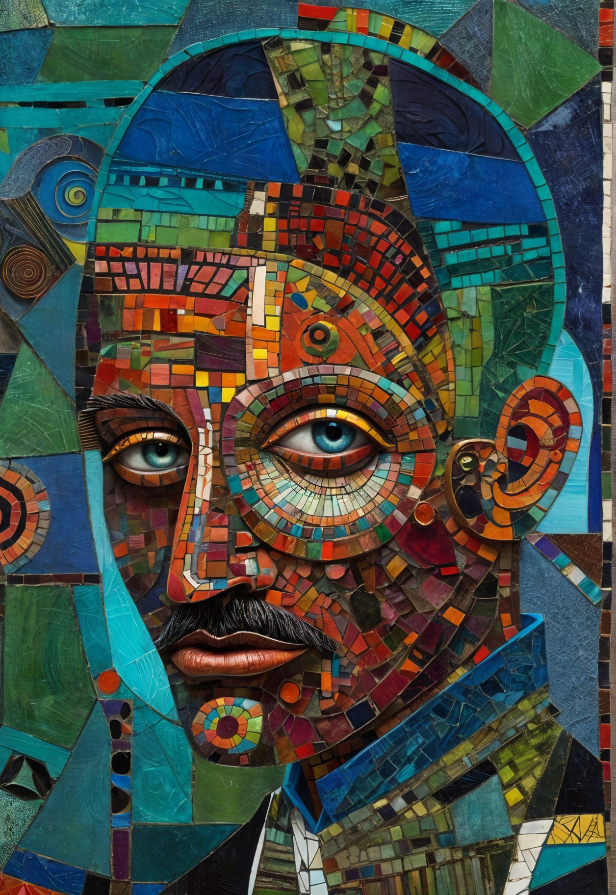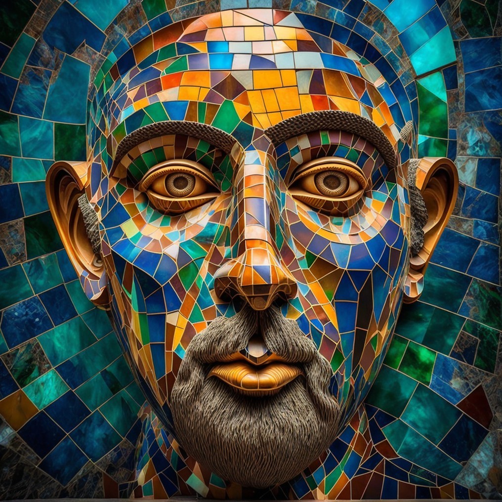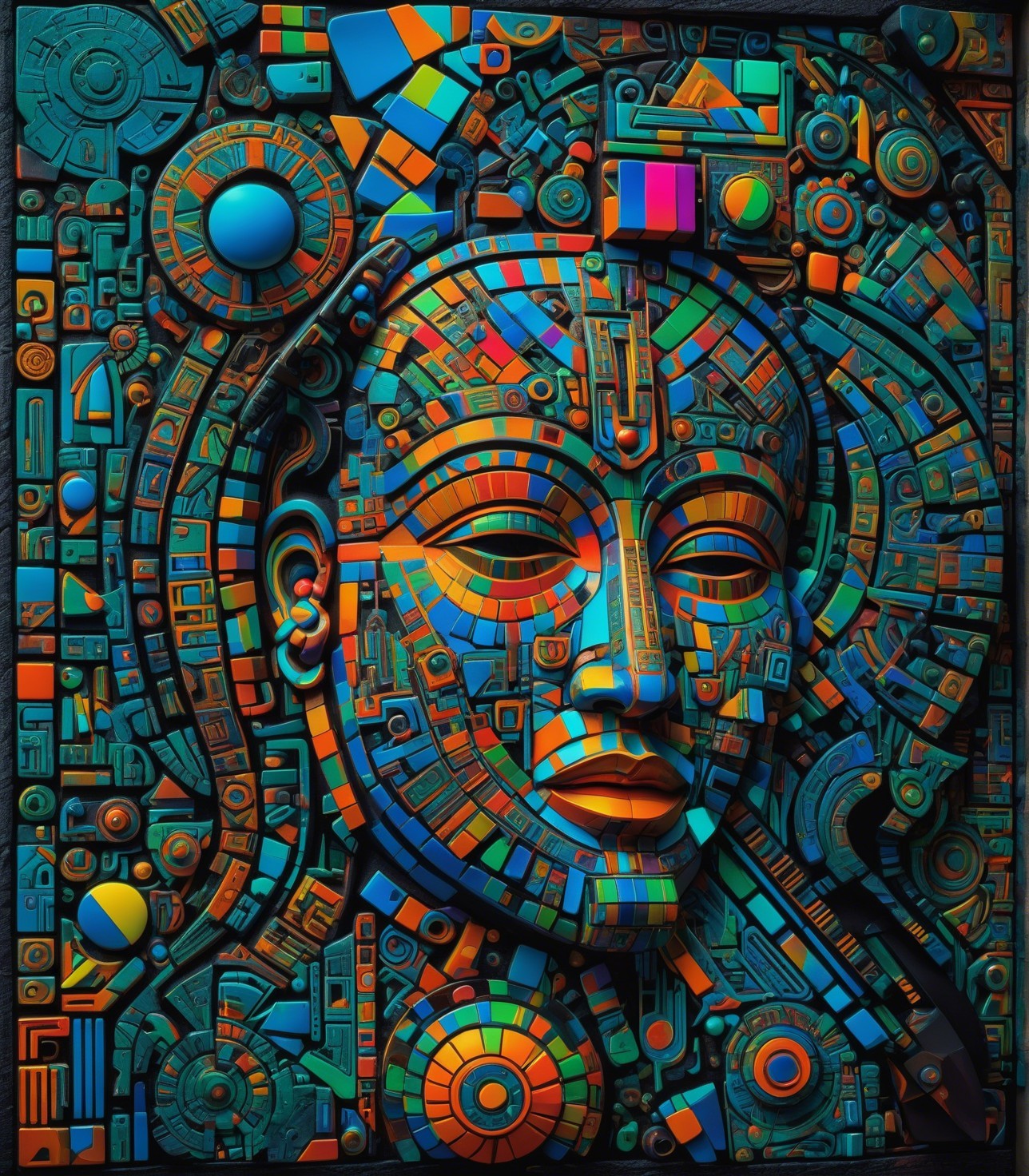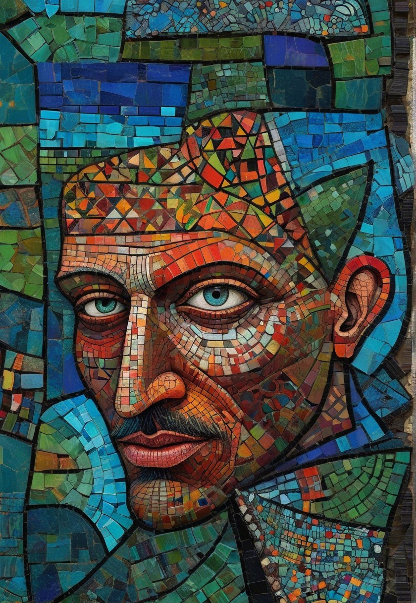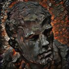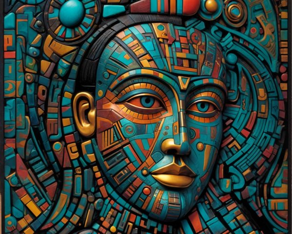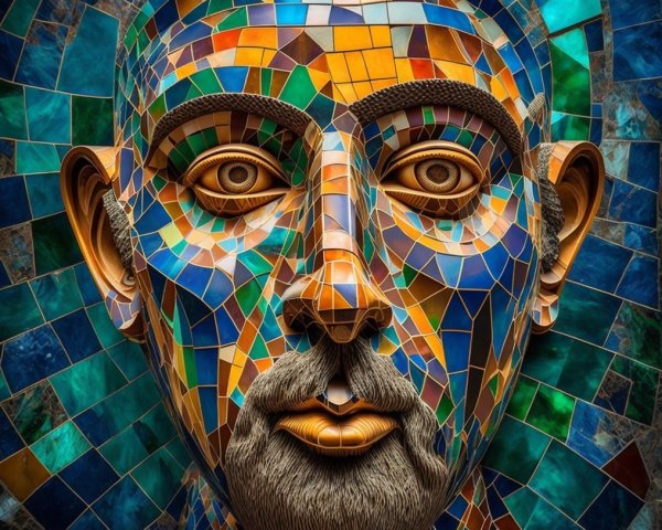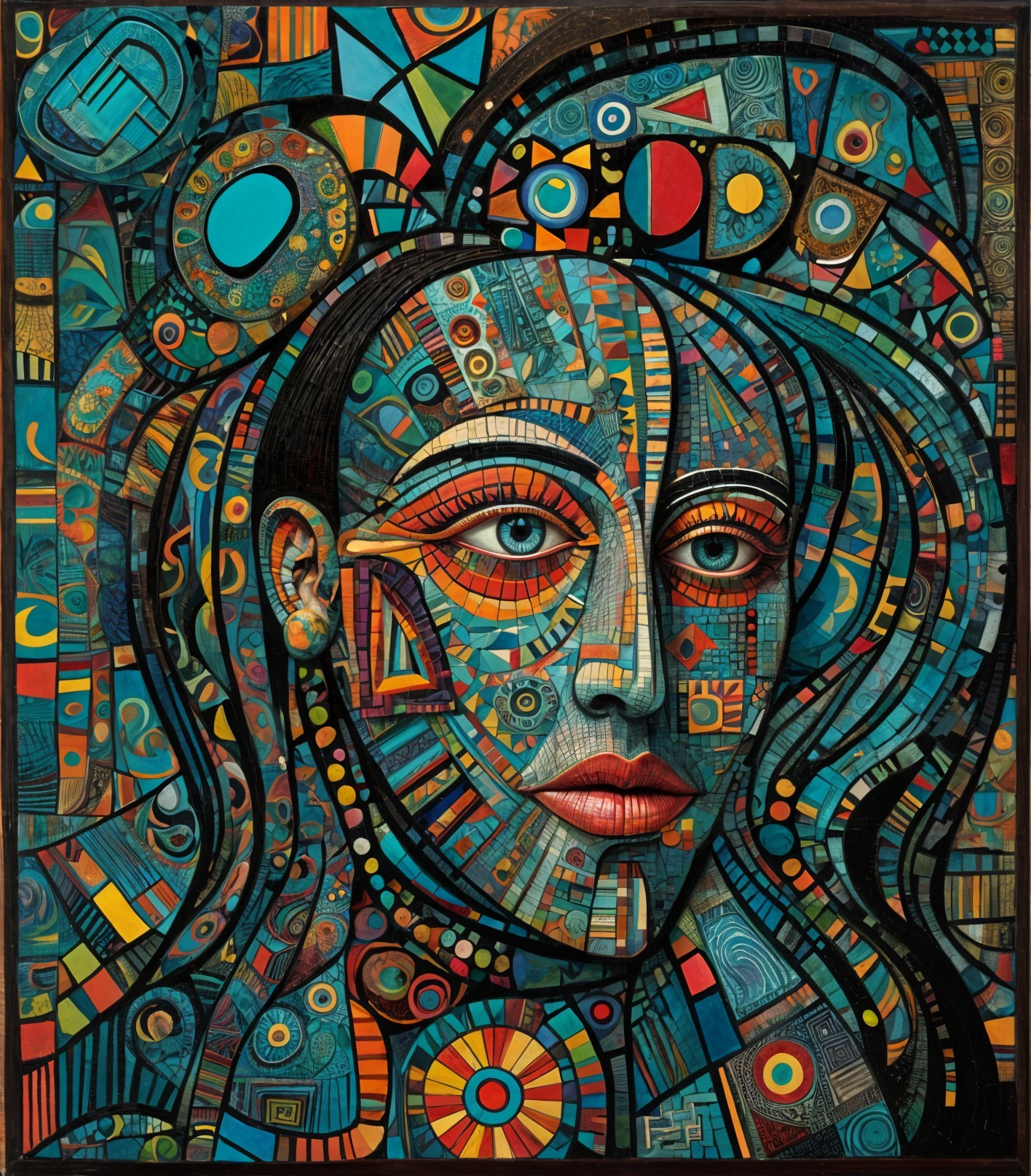The image features a striking figure with long, textured hair, vibrant red eyes, and a dark hood. Surrounding the figure is an abstract, colorful background that enhances its surreal presence.